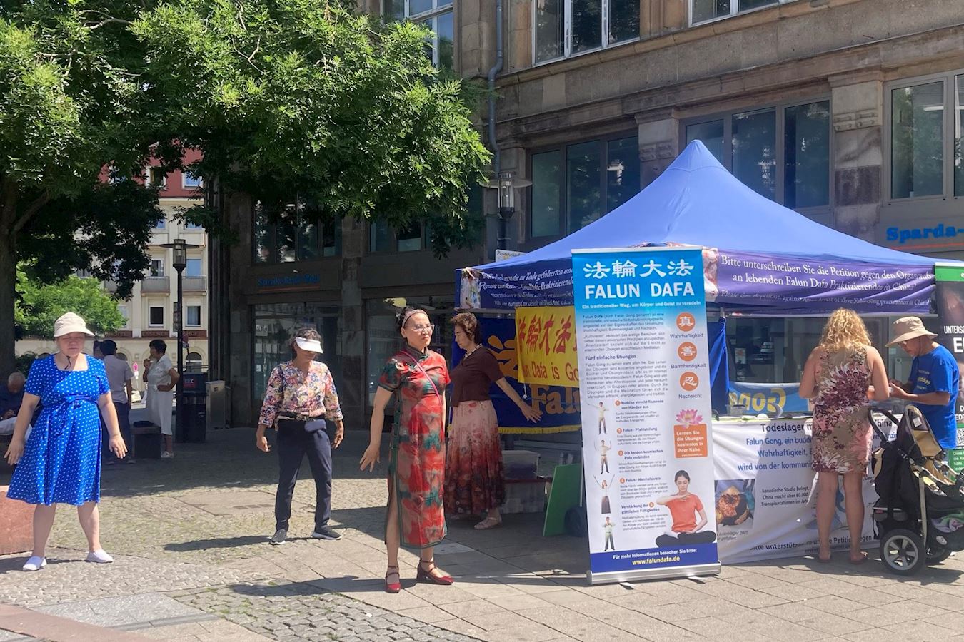 ![]() 图1:二零二五年七月十二日,德国法轮功学员在埃森(Essen)举办信息日活动,学员设立展位,和演示法轮功功法。 |