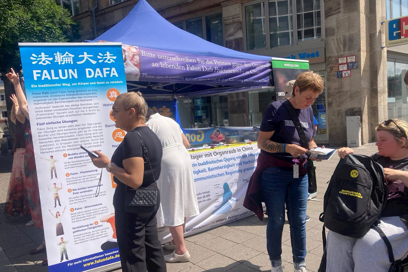 一般来说,德国人不随便签署自己的名字,但在法轮功展位这里好象没有了这个观念。有的人看到横幅,径直走上来索要资料或在制止中共活摘法轮功学员器官的请愿书签名。