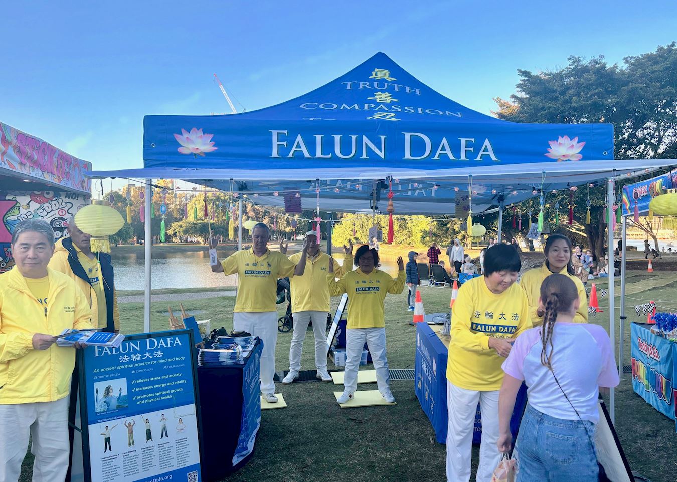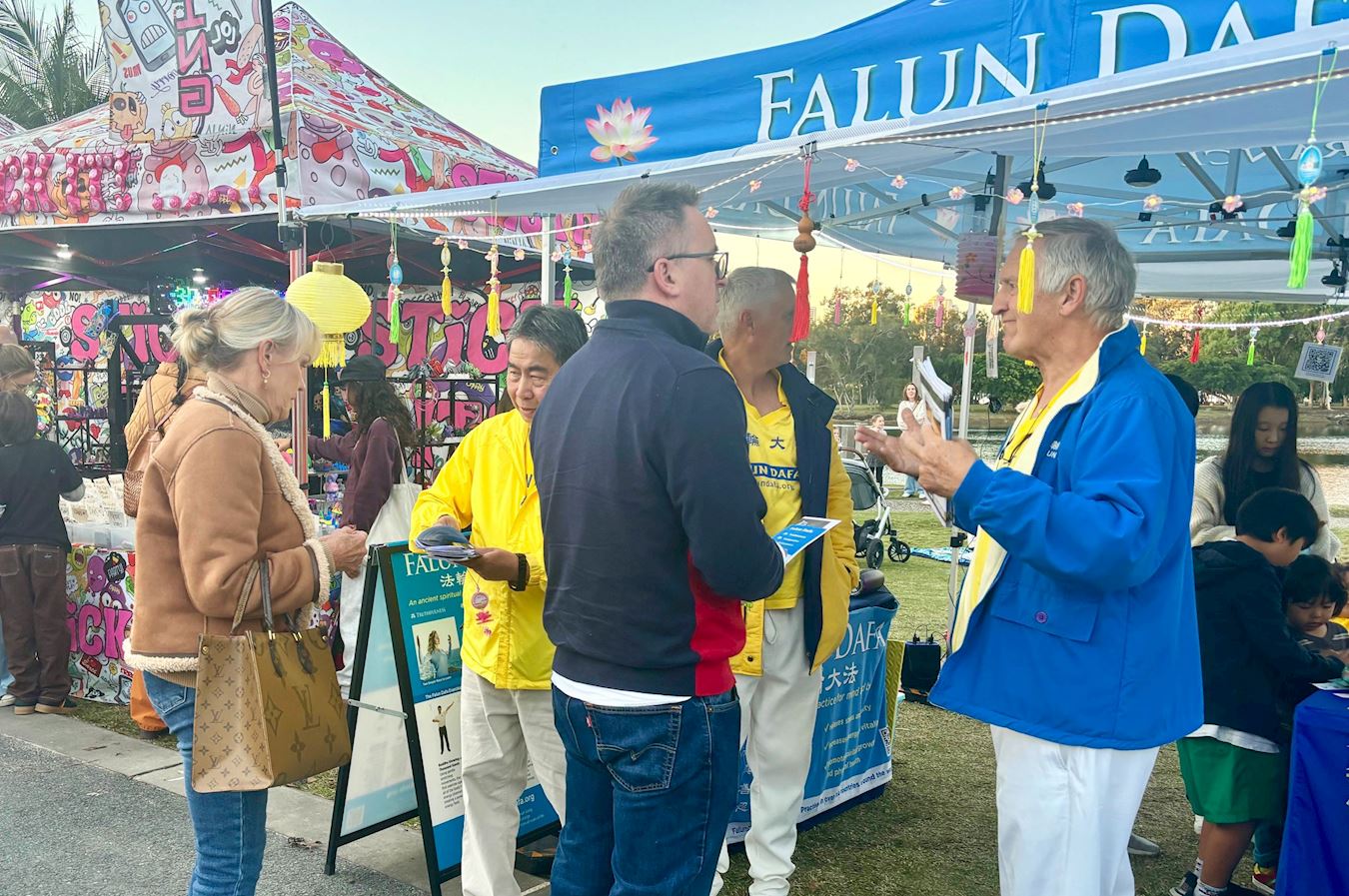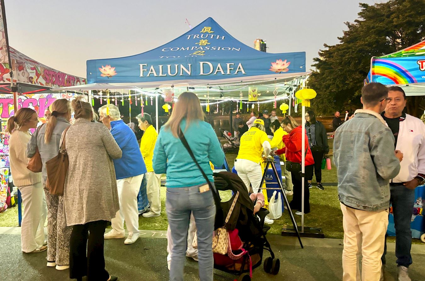 散发着纯正能量的法轮功展位,吸引着过往游客驻足,有些人观赏着法轮功学员演示的五套功法;有些人想学炼法轮功,询问炼功点的地址;有些人来到法轮功展位观看展板,询问法轮功的有关信息;还有人签名支持法轮功反迫害。