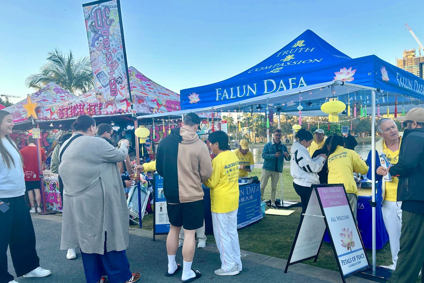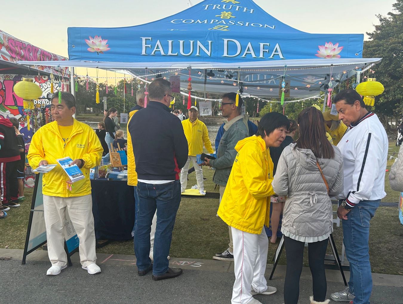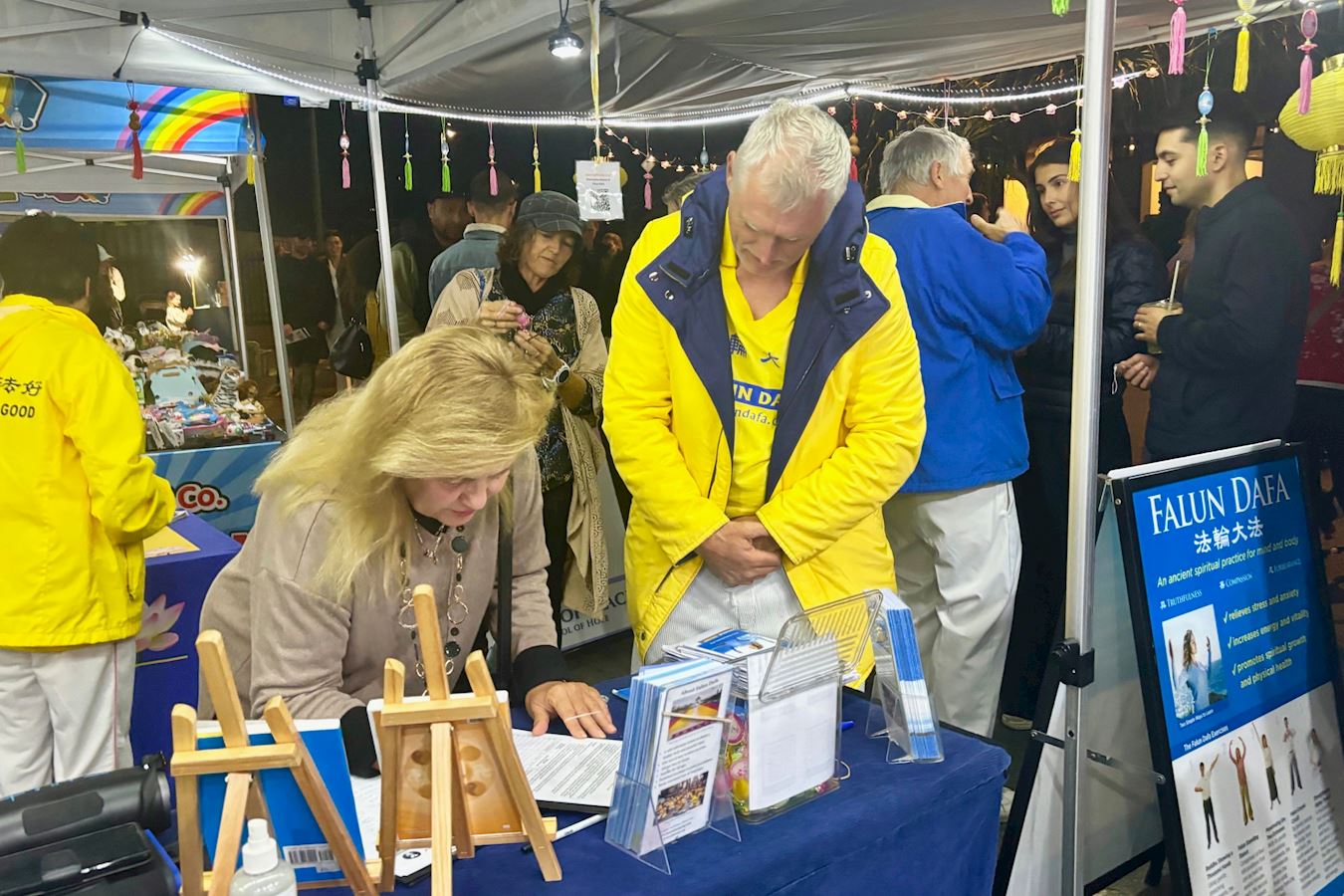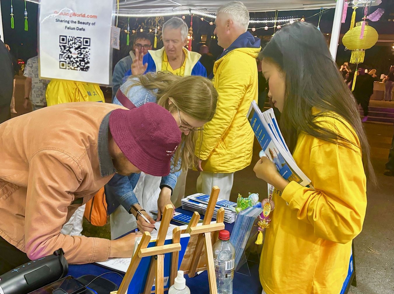 散发着纯正能量的法轮功展位,吸引着过往游客驻足,有些人观赏着法轮功学员演示的五套功法;有些人想学炼法轮功,询问炼功点的地址;有些人来到法轮功展位观看展板,询问法轮功的有关信息;还有人签名支持法轮功反迫害。