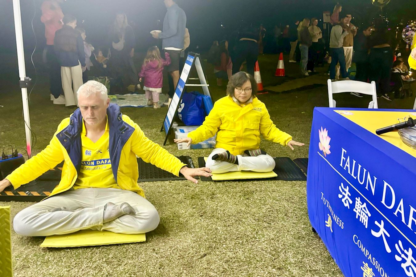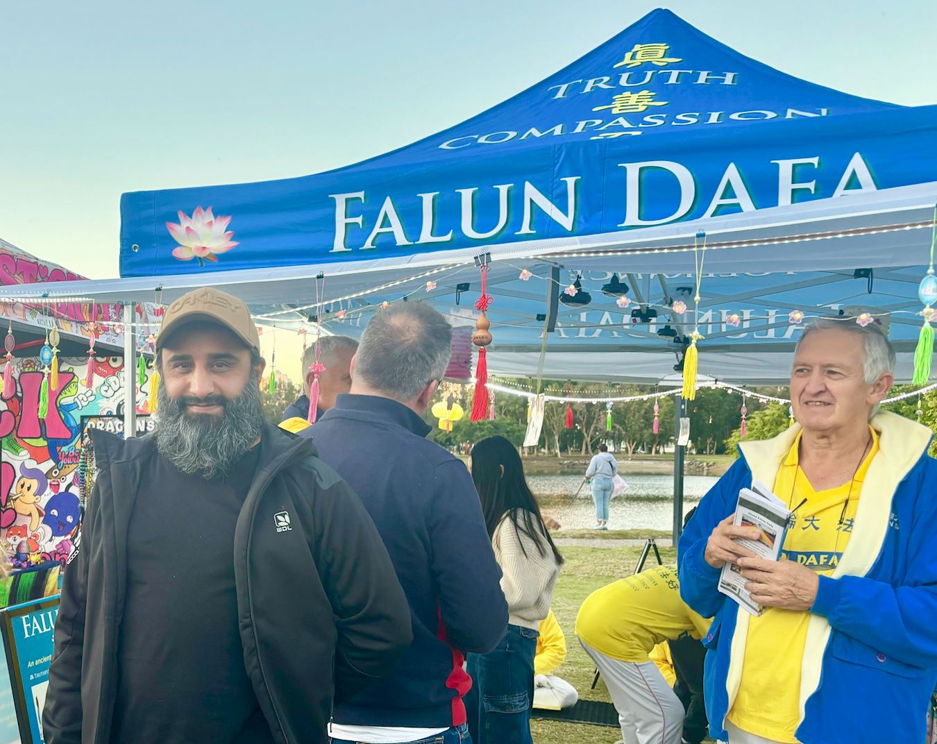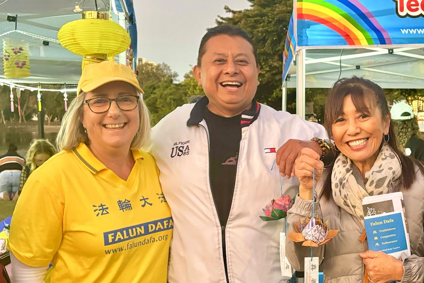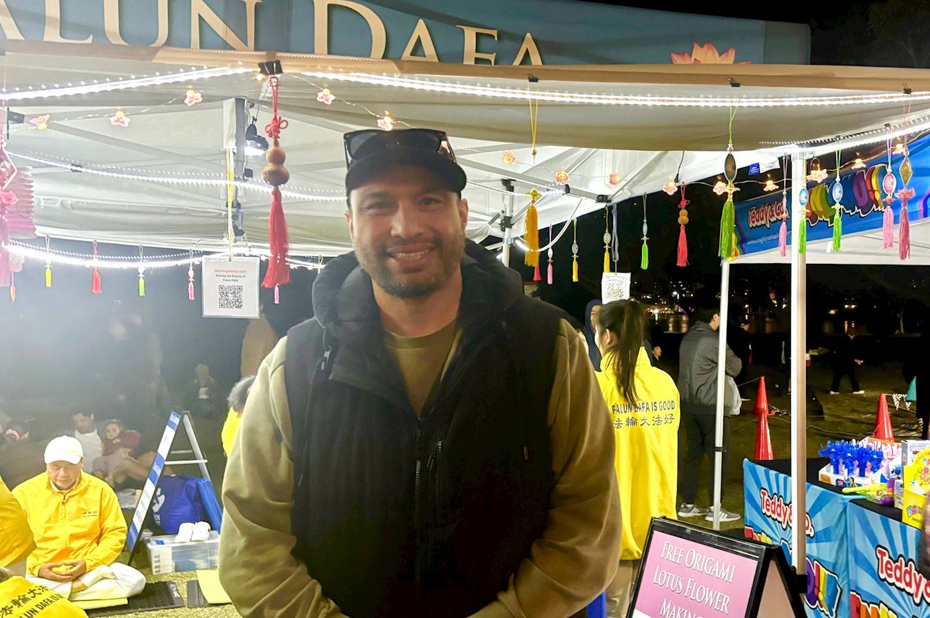 蓝斯·塔努瓦萨( Lance Tanuvasa)在法轮功展位前驻足良久,观看了学员展示的法轮功五套缓、慢、圆的功法,学员的动作优美舒展,尤其是祥和平静的打坐,让他感慨万千。他与法轮功学员交谈说:“我喜欢打坐,能让我很快地进入打坐状态。”