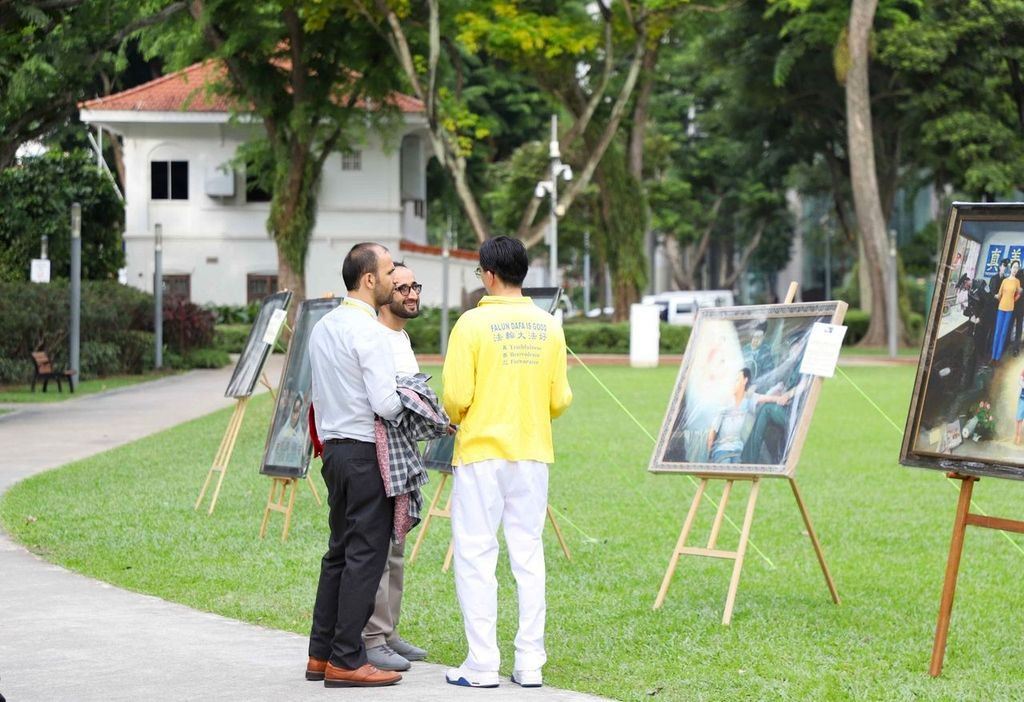 当天因缘际会来到活动现场的除新加坡本地人外,还有来自英国、法国、德国、奥地利、捷克、芬兰、西班牙、美国、马来西亚、印度、缅甸和中国等不同国家的游客、学生和工作人士。在一片祥和的氛围中,人们主动向法轮功学员了解真相,并谴责中共暴行。
