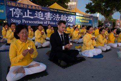 图3:圣地亚哥县第二选区监事办公室社区代表纳撒尼尔·哈里斯(Nathaniel Harris)(左二)加入法轮功学员的烛光夜悼。
