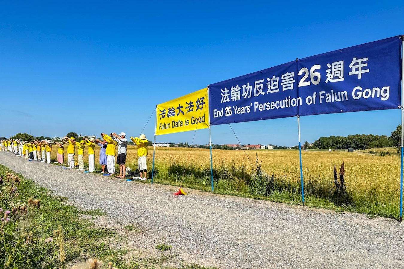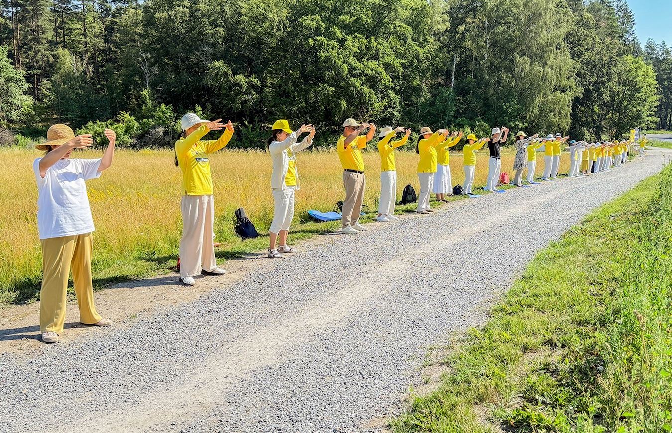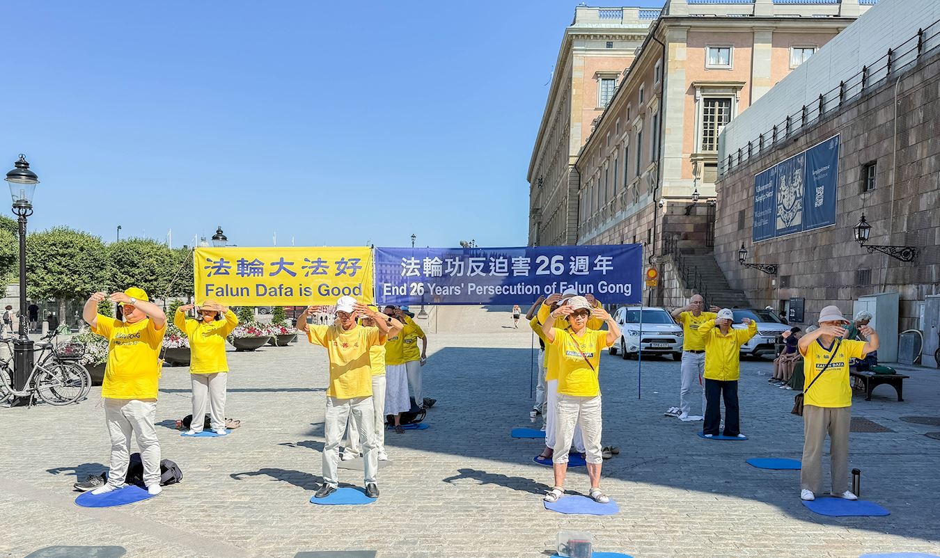 上午,法轮功学员在中使馆前草坪上展示法轮功的五套功法,向过往路人分发真相资料并征集签名。学员还向使馆内的工作人员宣读劝善信,并宣读了来自瑞典国会议员尼玛·古拉姆·阿里·普尔(Nima Gholam Ali Pour)和哥德堡市副市长、对中政策跨国议会联盟(IPAC)联合主席之一的伊丽莎白·蓝恩(Elisabeth Lann)发来的支持法轮功学员反迫害声明。活动现场平静祥和,过往车辆大多放慢速度缓缓驶过,或鸣笛向和平抗议的人群表达敬意。