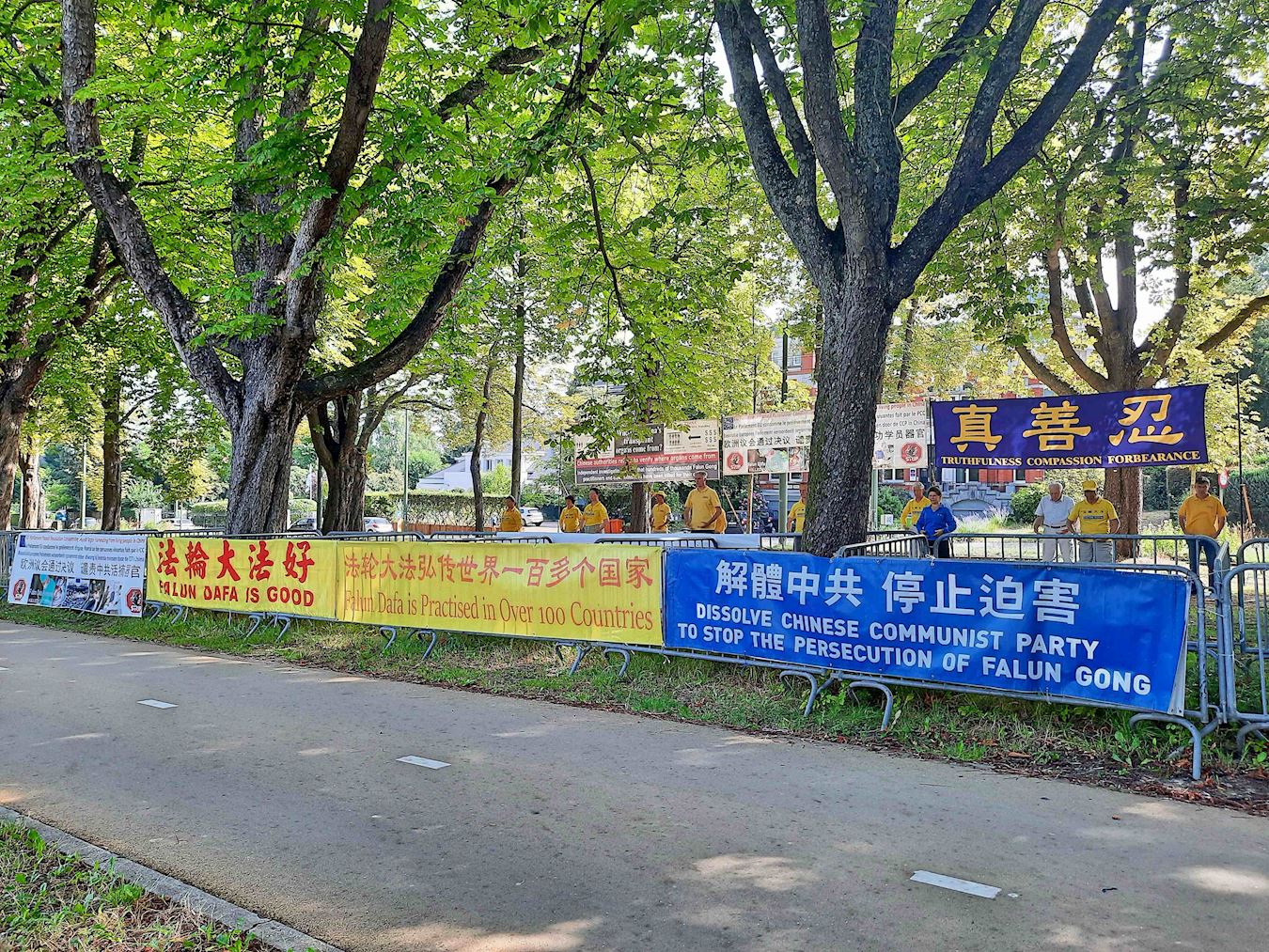 图1~6:二零二五年七月十八日,比利时部分法轮功学员为制止迫害,在中使馆前举办反对中共二十六年来持续迫害的活动。