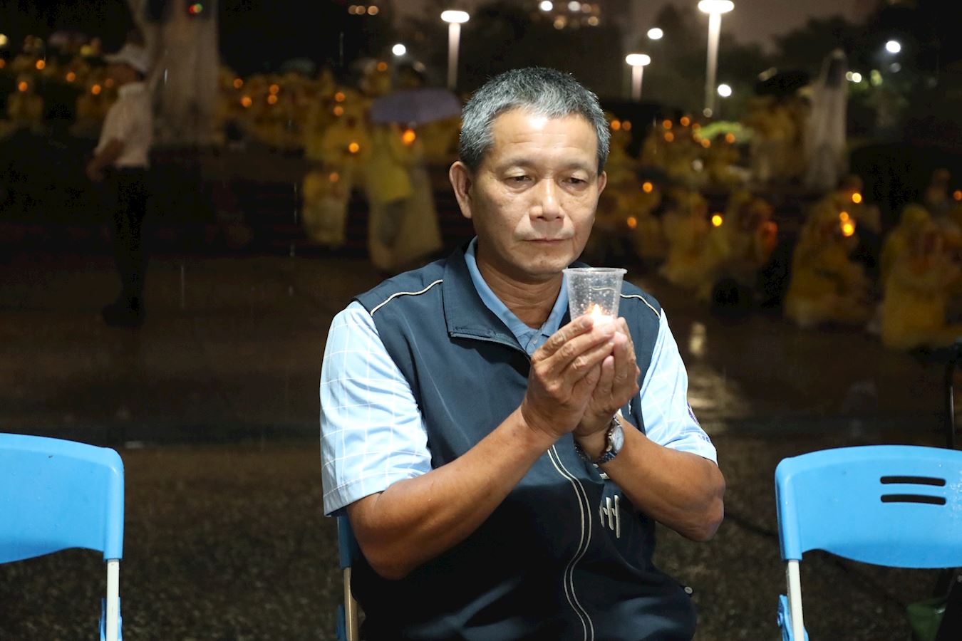 ![]() 图7:台中市议员刘士州手捧烛光,与现场学员一同悼念受迫害致死的学员。 |