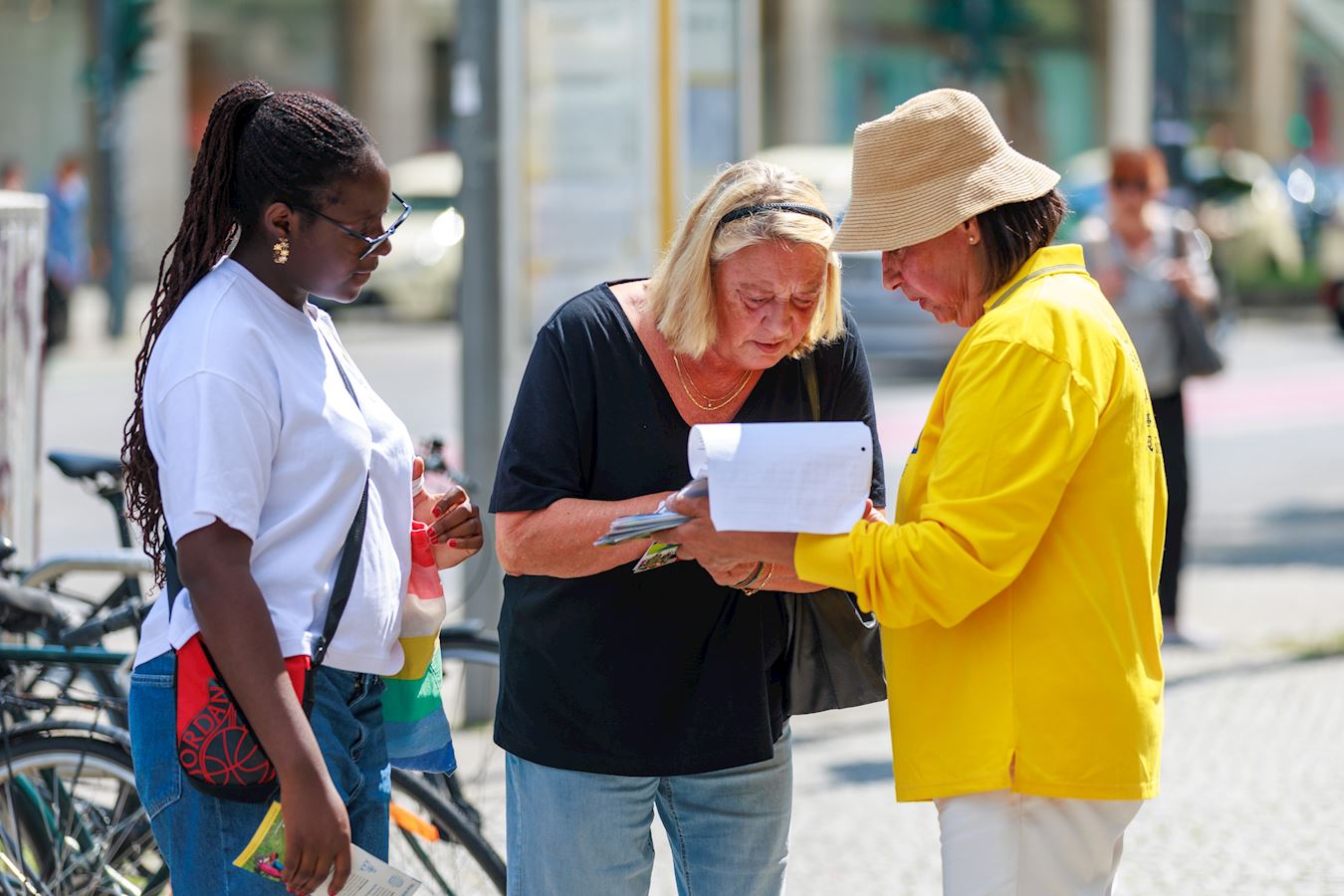 法轮功学员从十八日至二十日,在柏林连续三天分别在中使馆前、市中心和公园举行反迫害集会活动,呼吁国际社会关注中国人权状况,要求中共立即停止迫害。过往民众纷纷表示已了解过相关真相,他们非常乐意签名声援法轮功学员反迫害,并希望中共立即停止惨无人道的活摘法轮功学员器官的罪行。