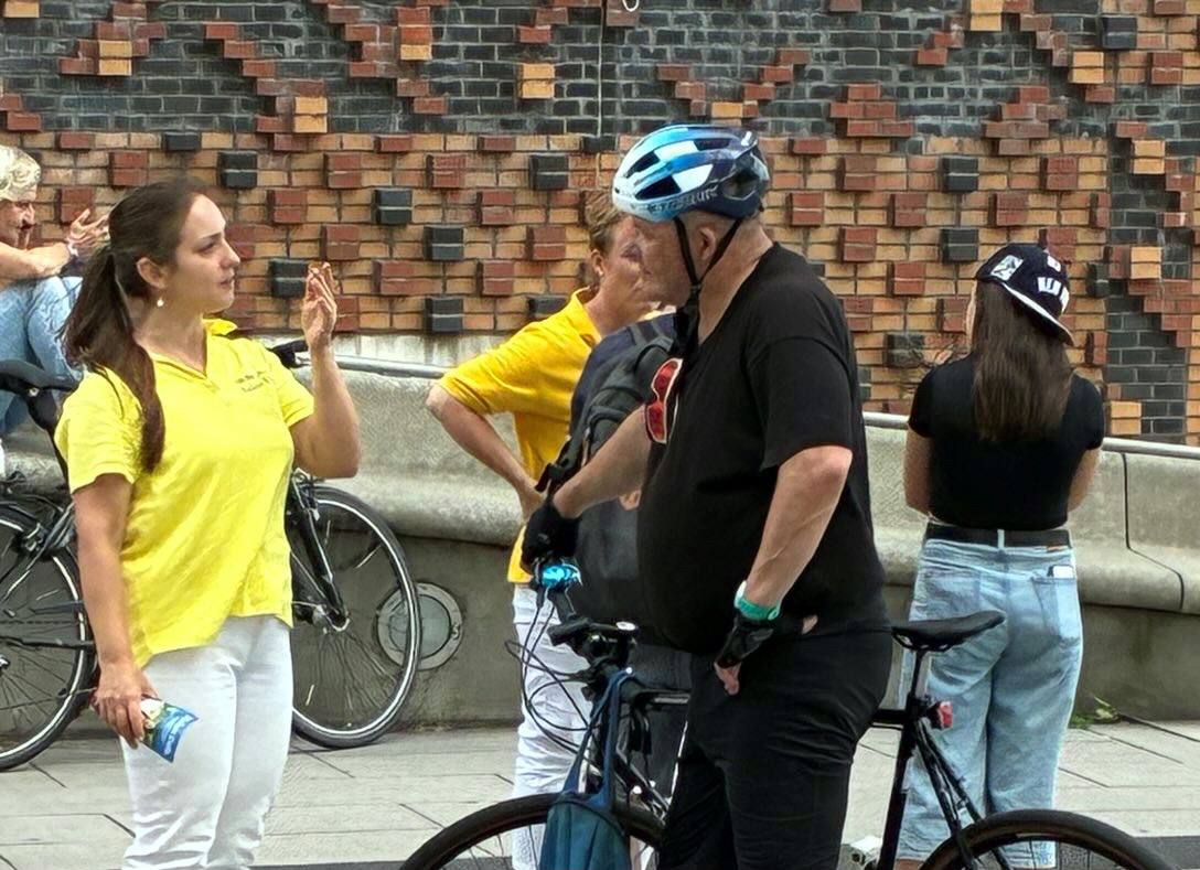 那位女士看到学员的活动后,听法轮功学员告诉她什么是法轮功,为什么中共要迫害法轮功,并历数了中共如何迫害民众的罪行,那位女士听后直点头。学员告诉她,现在有超过四亿四千万大陆民众已经做了三退(退党、退团、退少先队),有的高官全家都退了。还有一个派出所所长半夜敲响法轮功学员家门,递给学员全家名单,要求学员帮忙三退。