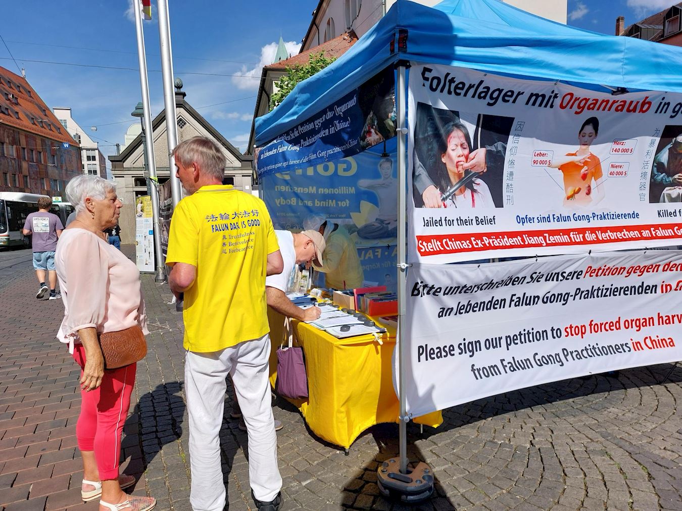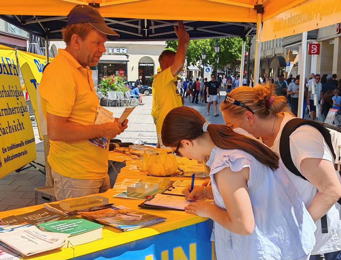 七月十二日,法轮功学员在南部奥格斯堡举办活动,一位大陆女士观看学员炼功,并一直愉快地与不同的学员交谈,临走前她同意用化名退出中共邪党。