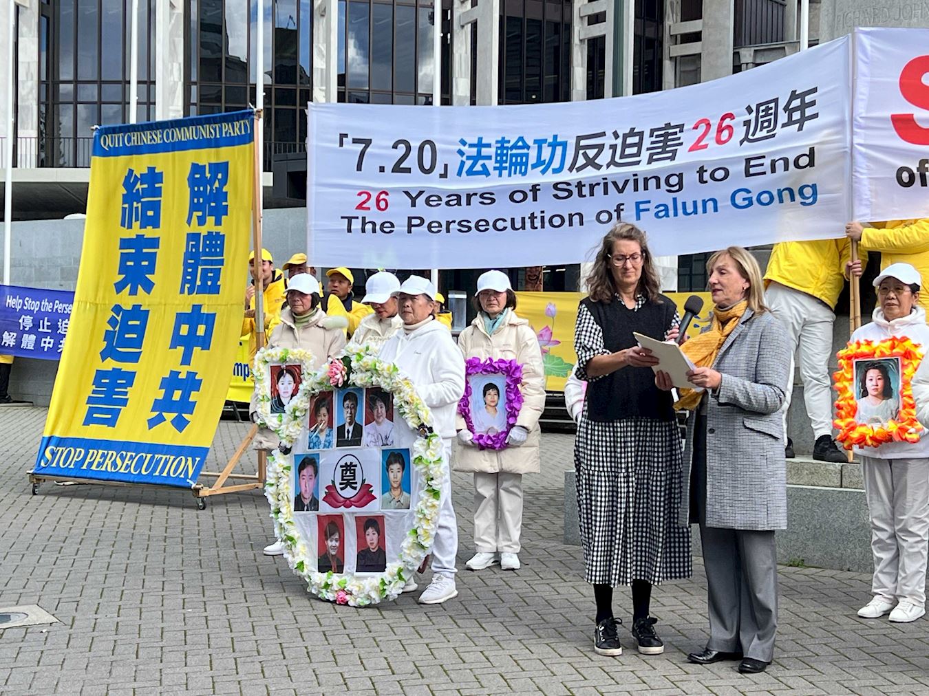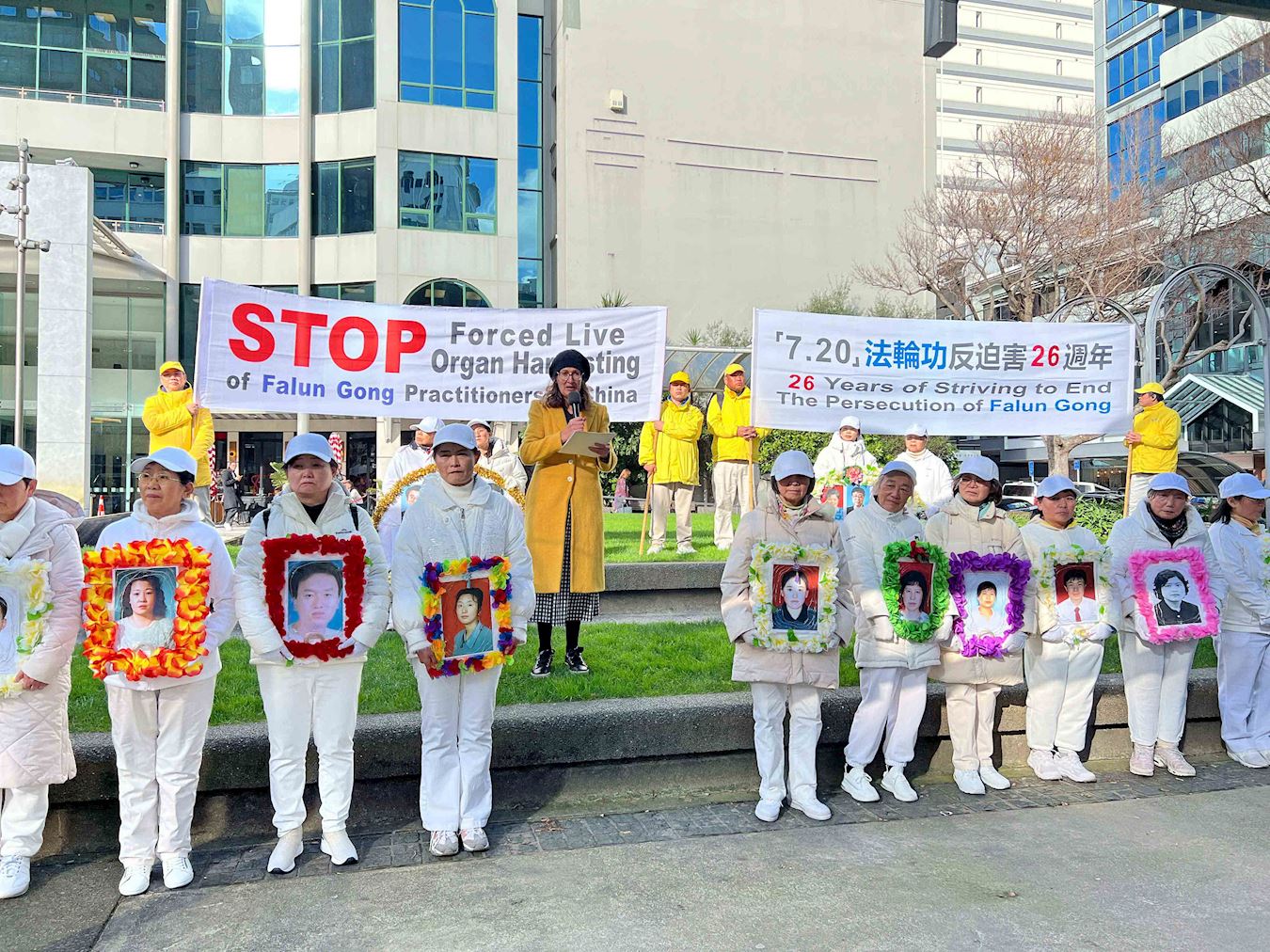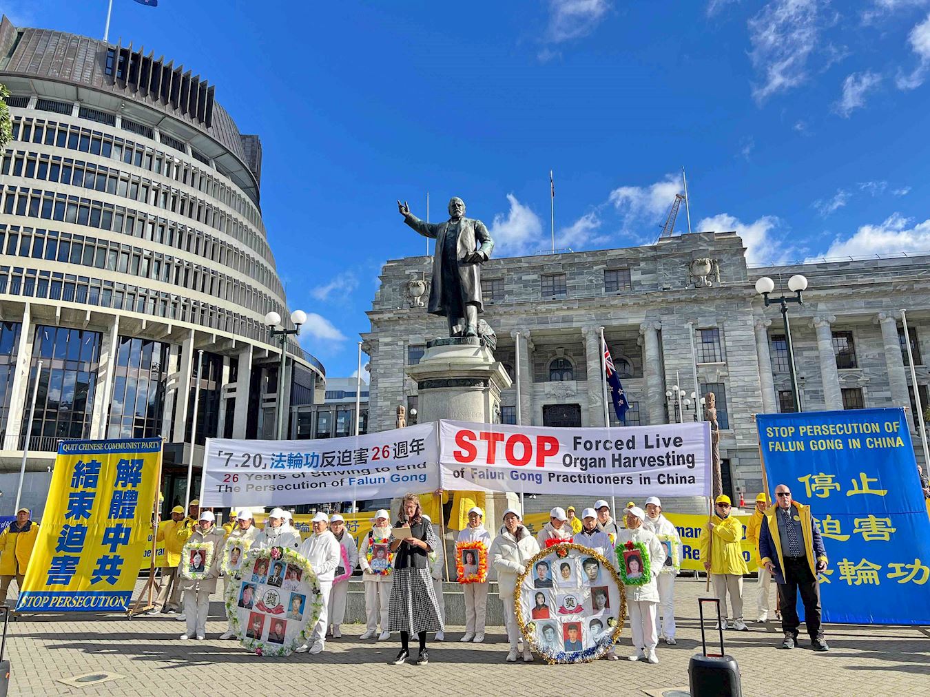 在新西兰国会大厦前的集会上,“终止中国滥用器官移植国际联盟”(ETAC)新西兰代表玛戈·麦克维卡(Margo MacVicar)发出呼吁,敦促新西兰政府采取行动,制止中共持续进行的活摘器官罪行。