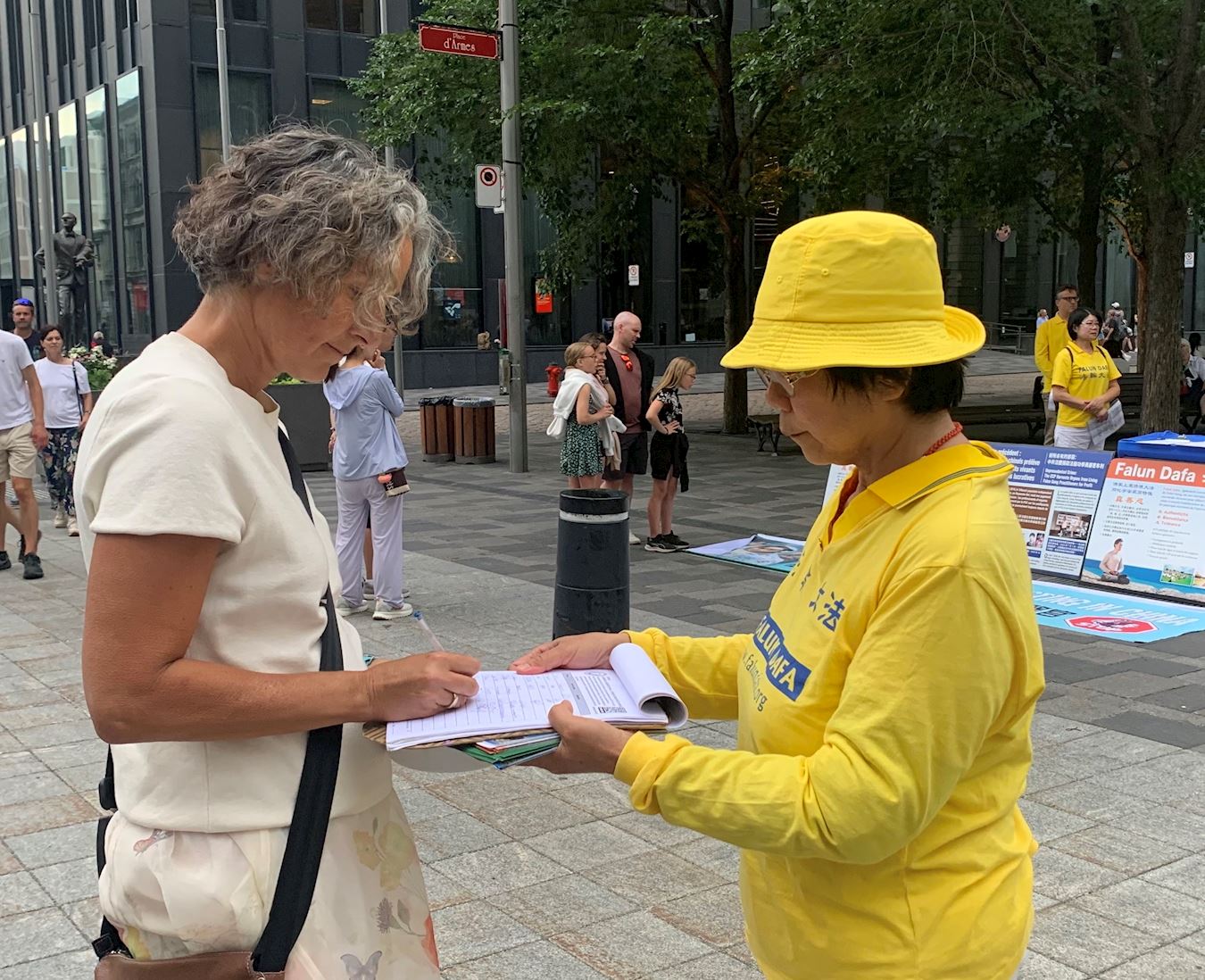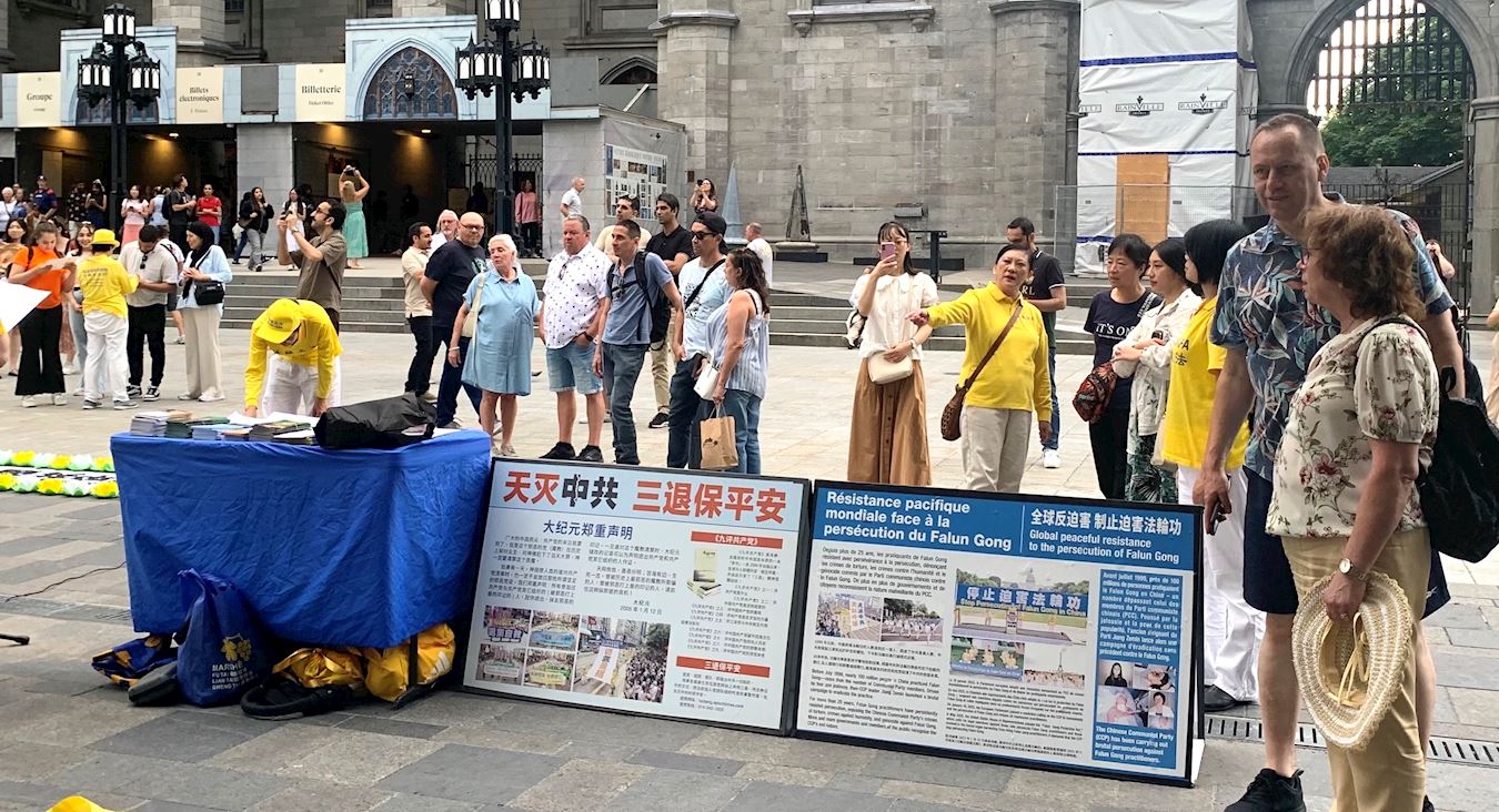 兵器广场是蒙特利尔著名景点,一拨拨的游客驻足观看真相展板,聆听法轮功学员的发言。有人流泪了,许多人在征签信上签名,支持法轮功学员反迫害。