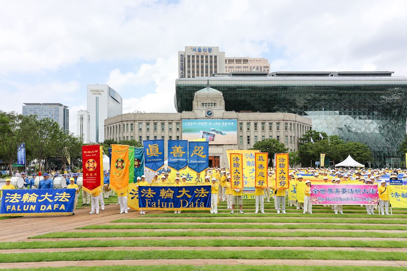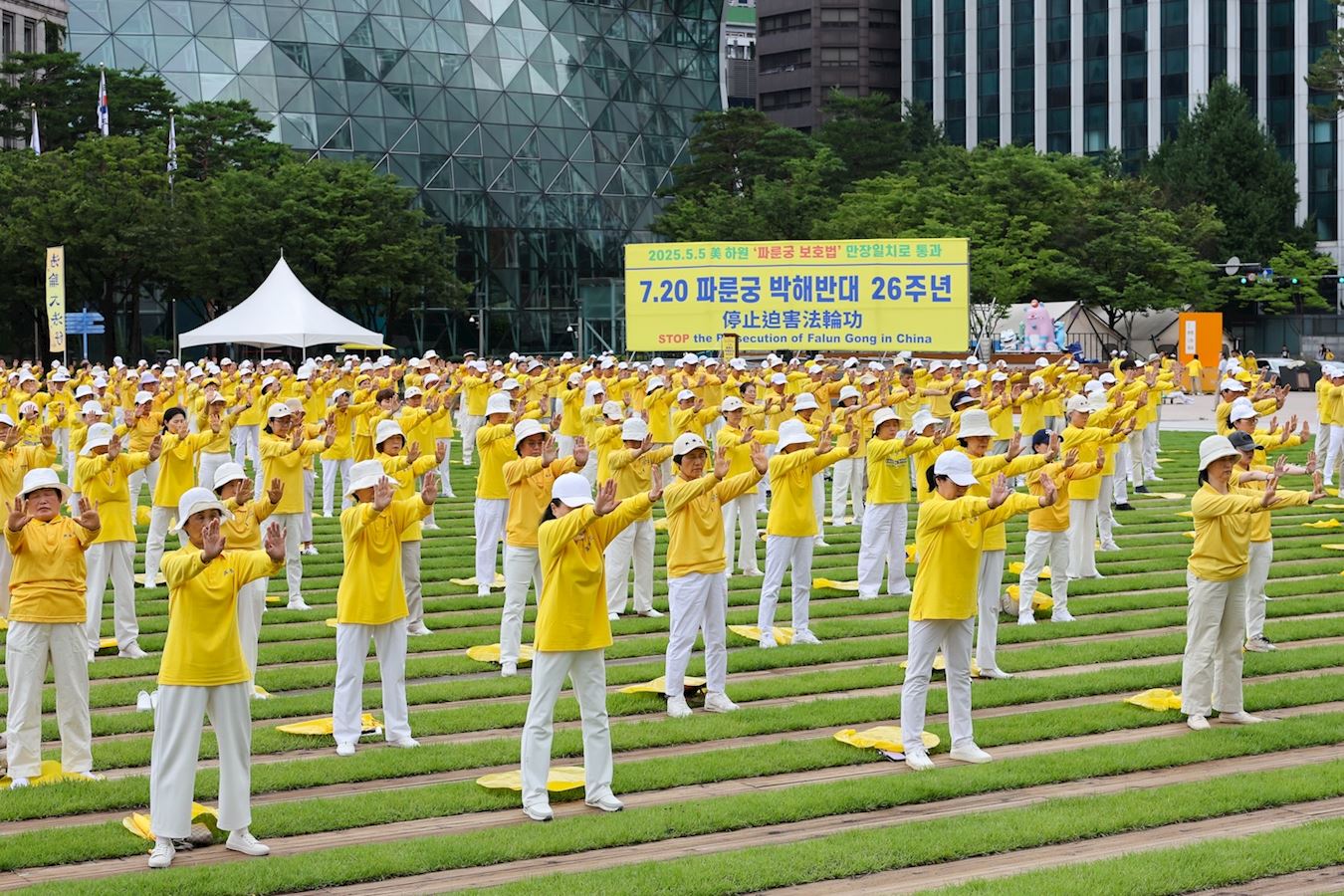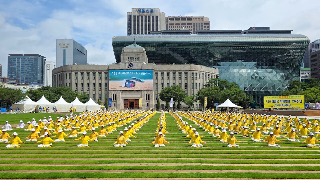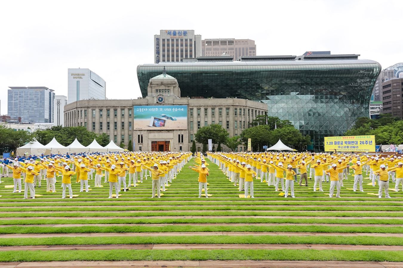 全国各地法轮功学员们聚集在首尔广场,他们身着黄色上衣、白色裤子,在正式活动开始前进行了约一个半小时的集体炼功展示。由于是早晨时间,不少下榻附近酒店的外国游客路过时被集体炼功场面吸引,纷纷驻足观看并用手机拍照。一些路人甚至跟着做炼功动作。