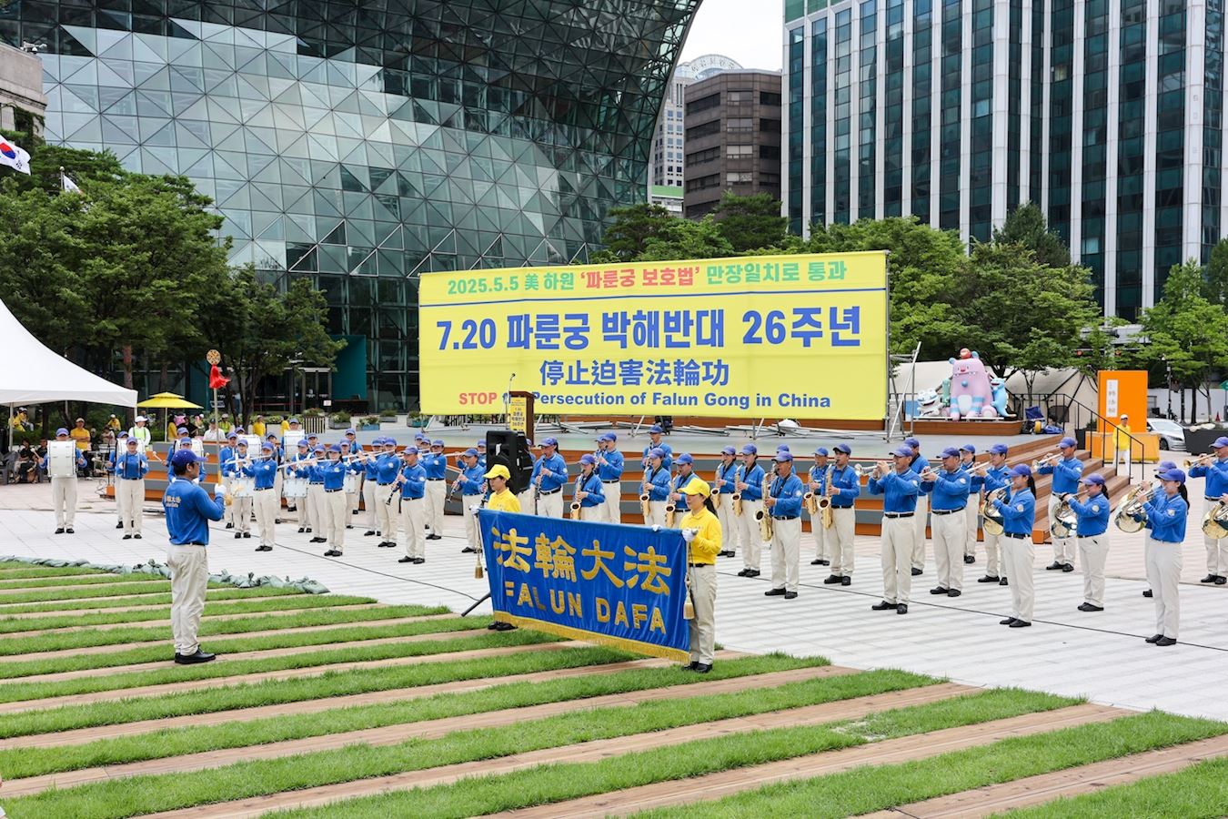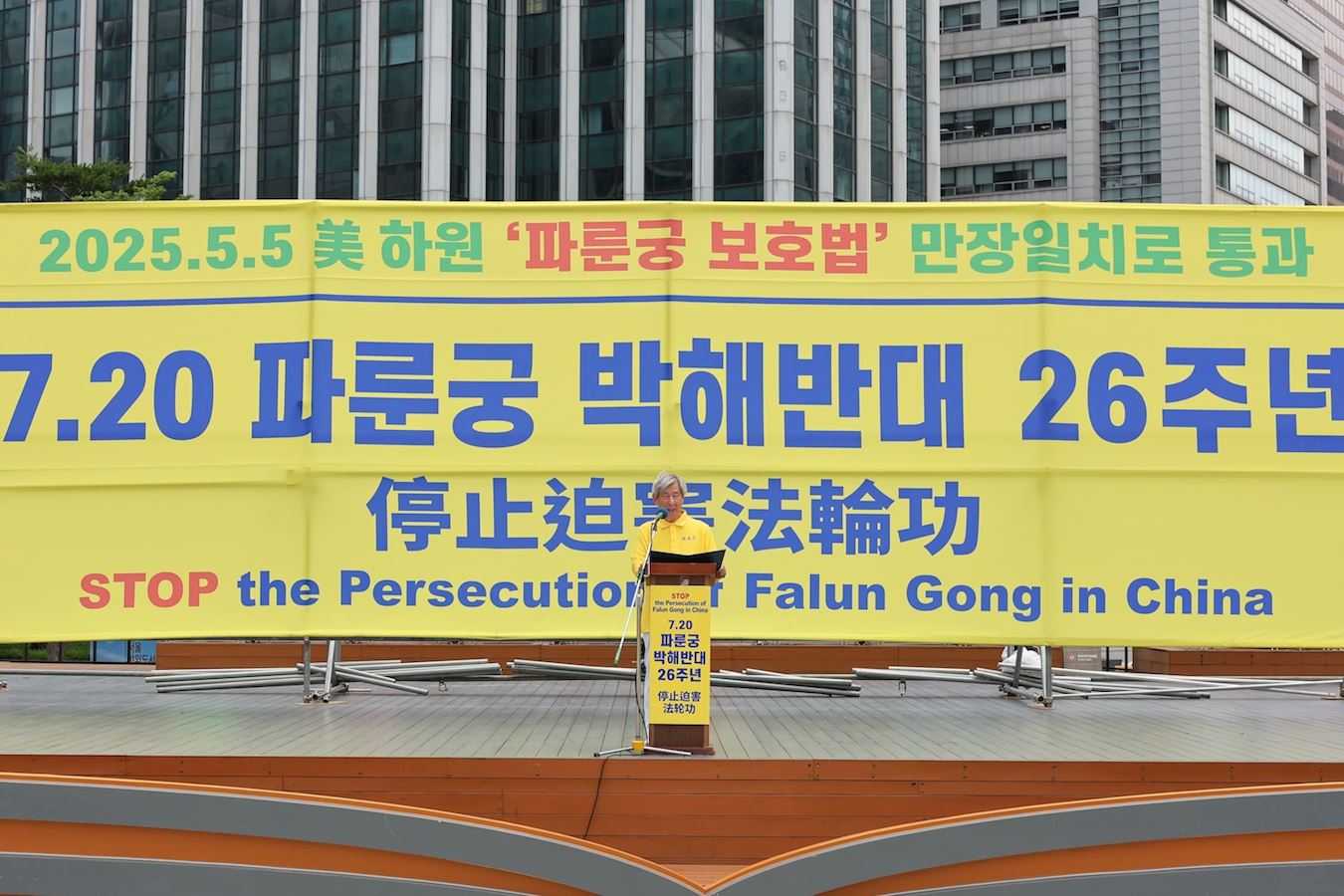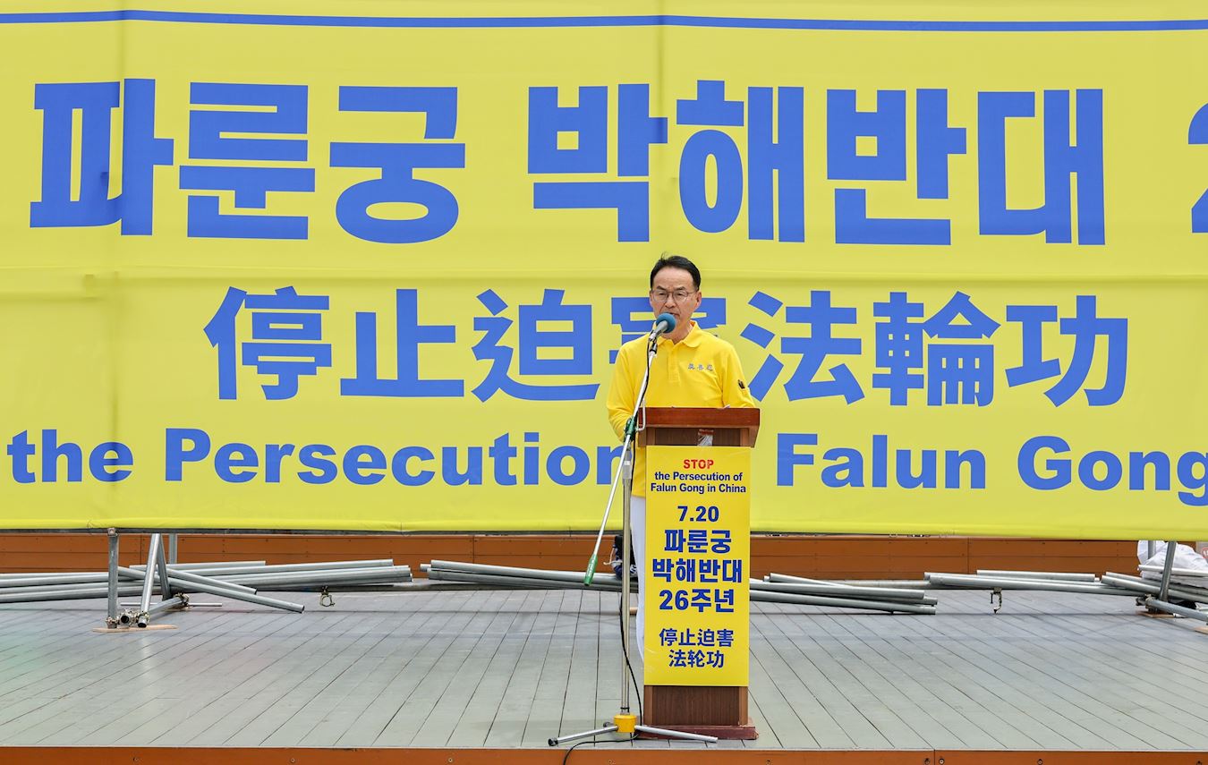 集会上,主持人介绍了“七·二零”活动的意义,接着韩国法轮大法佛学会会长权洪大宣读了“七·二零反迫害二十六周年”声明。
