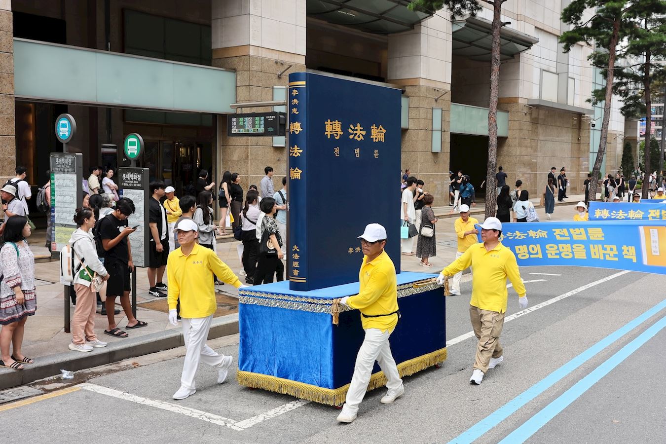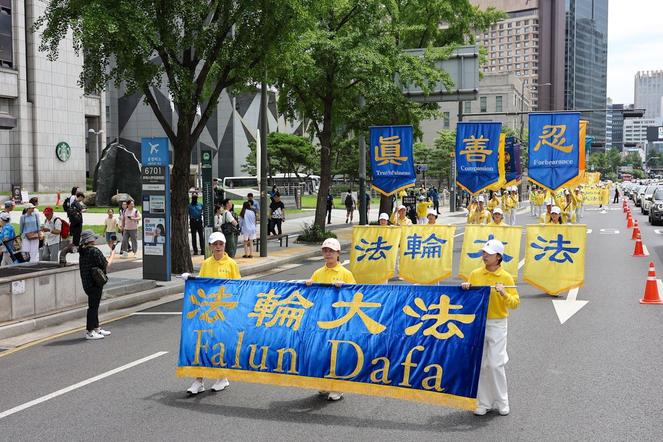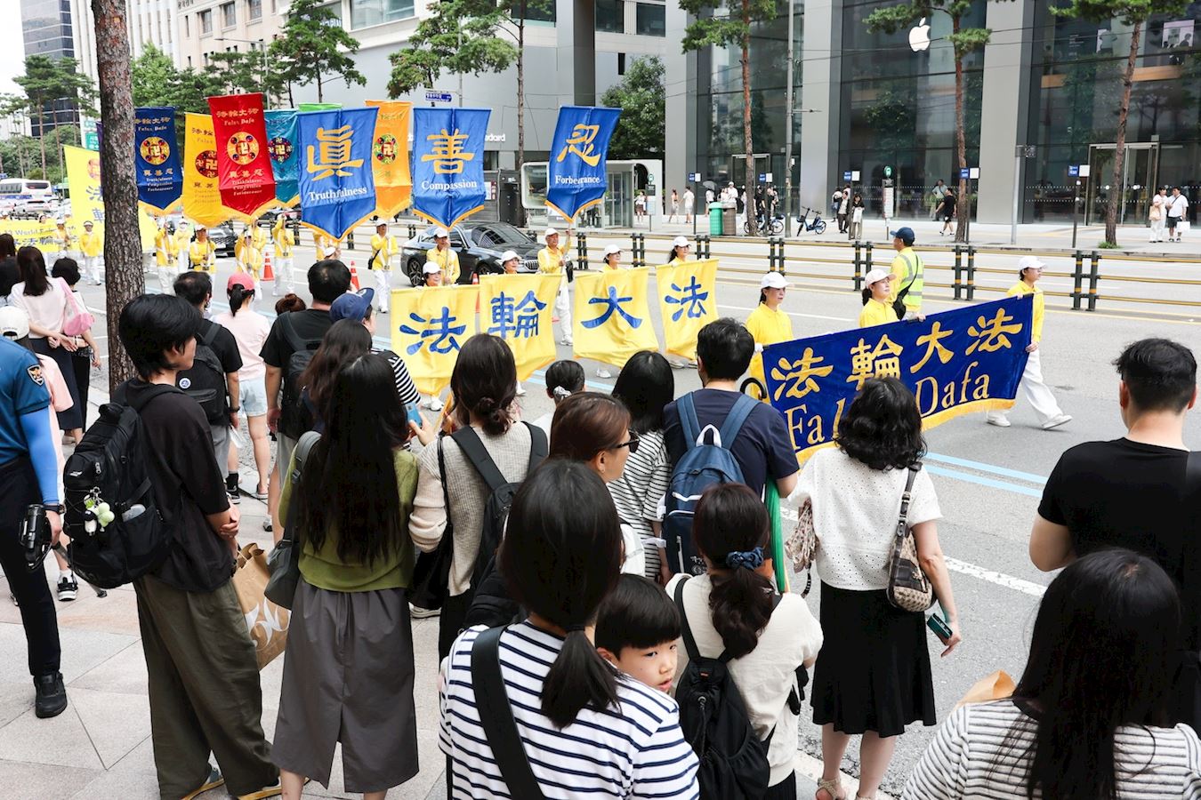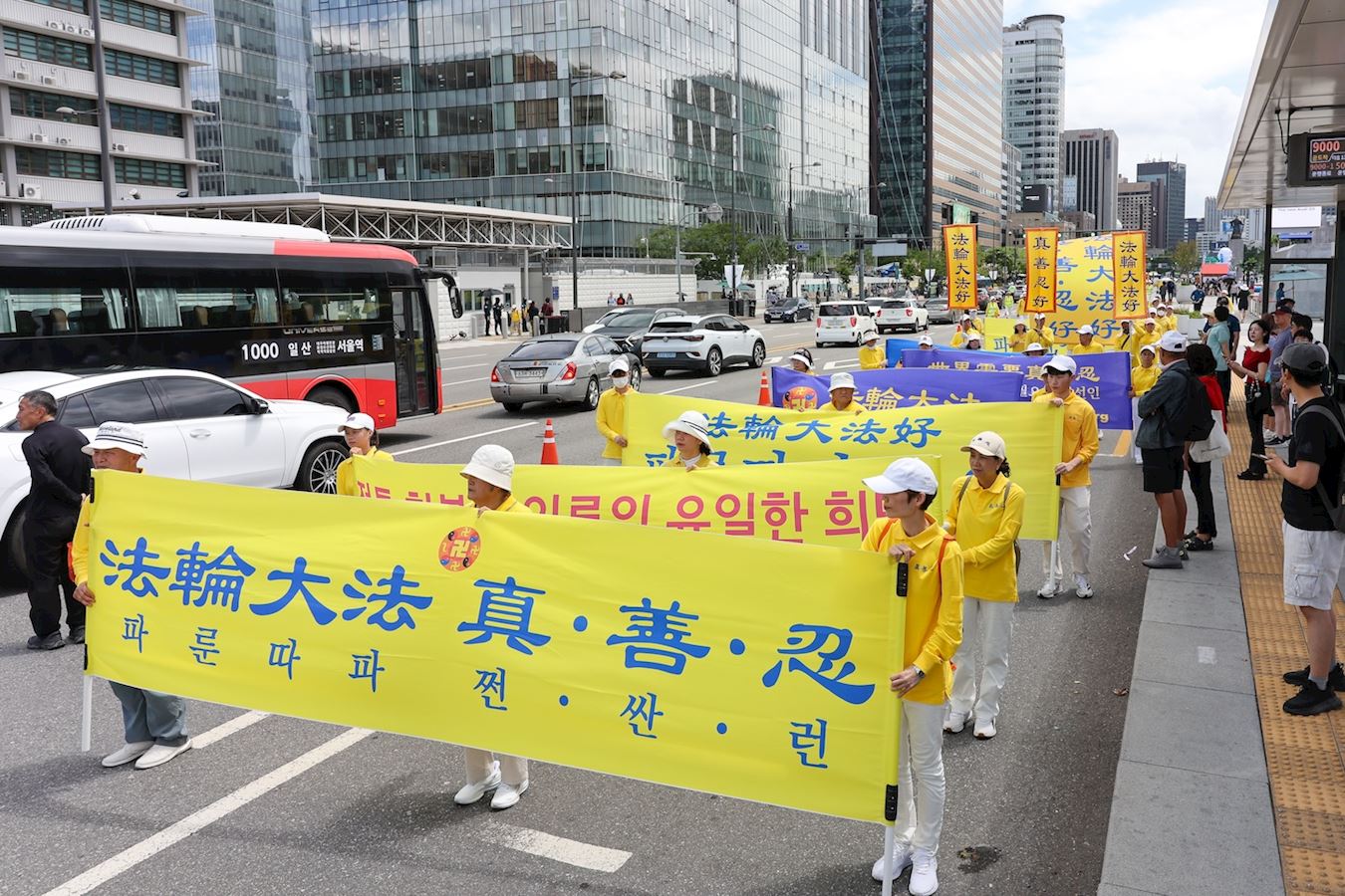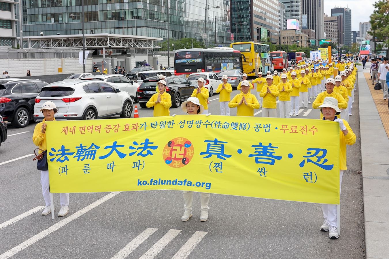 在曹溪寺前等公交车的黄京姬(황경희)说:“我曾几次往返中国,对中国限制宗教信仰自由方面有切身体会。我亲眼看到中共打压教会,法轮功学员们聚在一起炼功也被打压,中共可能是担心形成势力,但这种想法完全说不通。法轮功连宗教都不是,我觉得法轮功是为了修身养性而进行的打坐。”她鼓励法轮功学员们说:“希望你们坚持住。加油!”