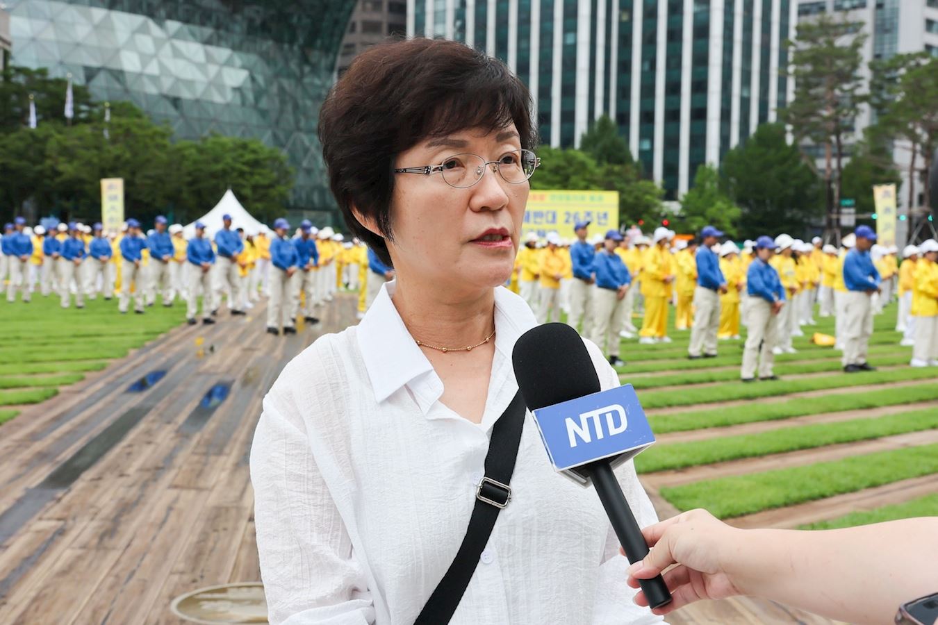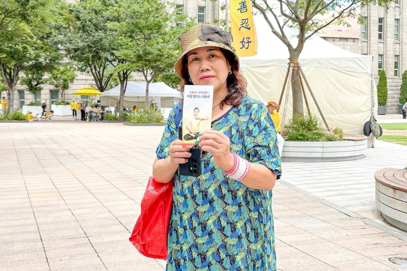 在昌原担任小学保健教师的偰明子(설명자)女士,自四年前开始修炼法轮功以来,每年都积极参与法轮功反迫害活动。她表示:“自从修炼法轮功后,我觉得有责任向人们传递法轮功的真相,因此每年都会参加活动。看到中共犯下如此残忍的罪行,我觉得必须将其广泛揭露,让世人了解真相。韩国也不应再继续保持沉默,应呼吁无条件、立即释放中国境内所有被无辜关押的法轮功修炼者和受害者。”