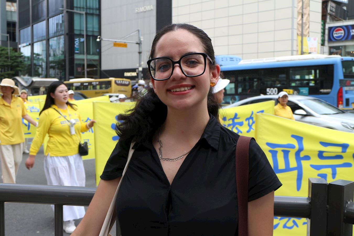 当游行队伍经过明洞时,记者遇到来自法国的游客克洛伊(Chloe)。她表示,坚决反对以任何形式对宗教信仰进行非法迫害,尤其是“强制摘取人体器官”这种行为,绝对无法接受。她说,游行的整体气氛非常和平祥和,天国乐团的演奏给她留下了非常积极的印象。