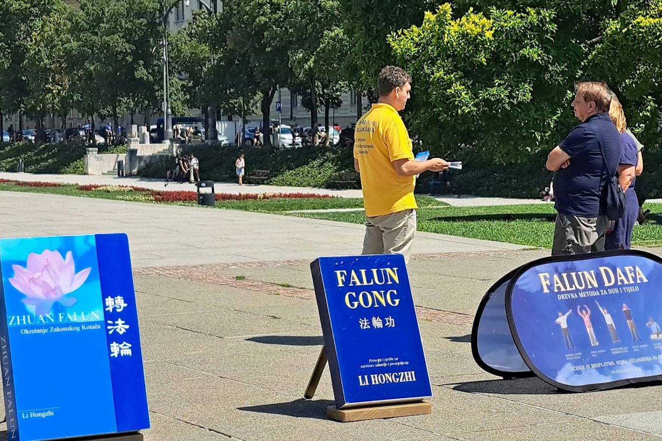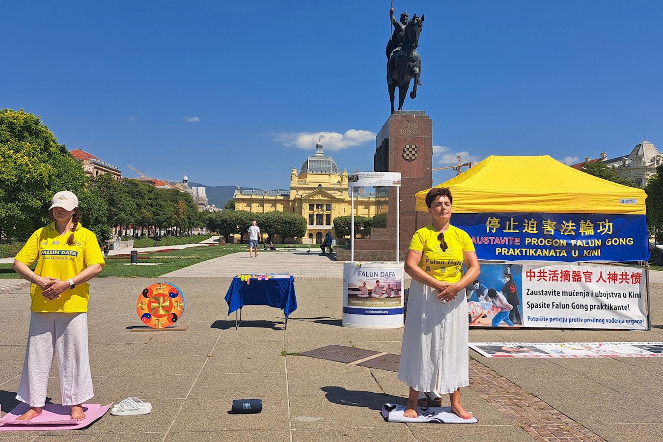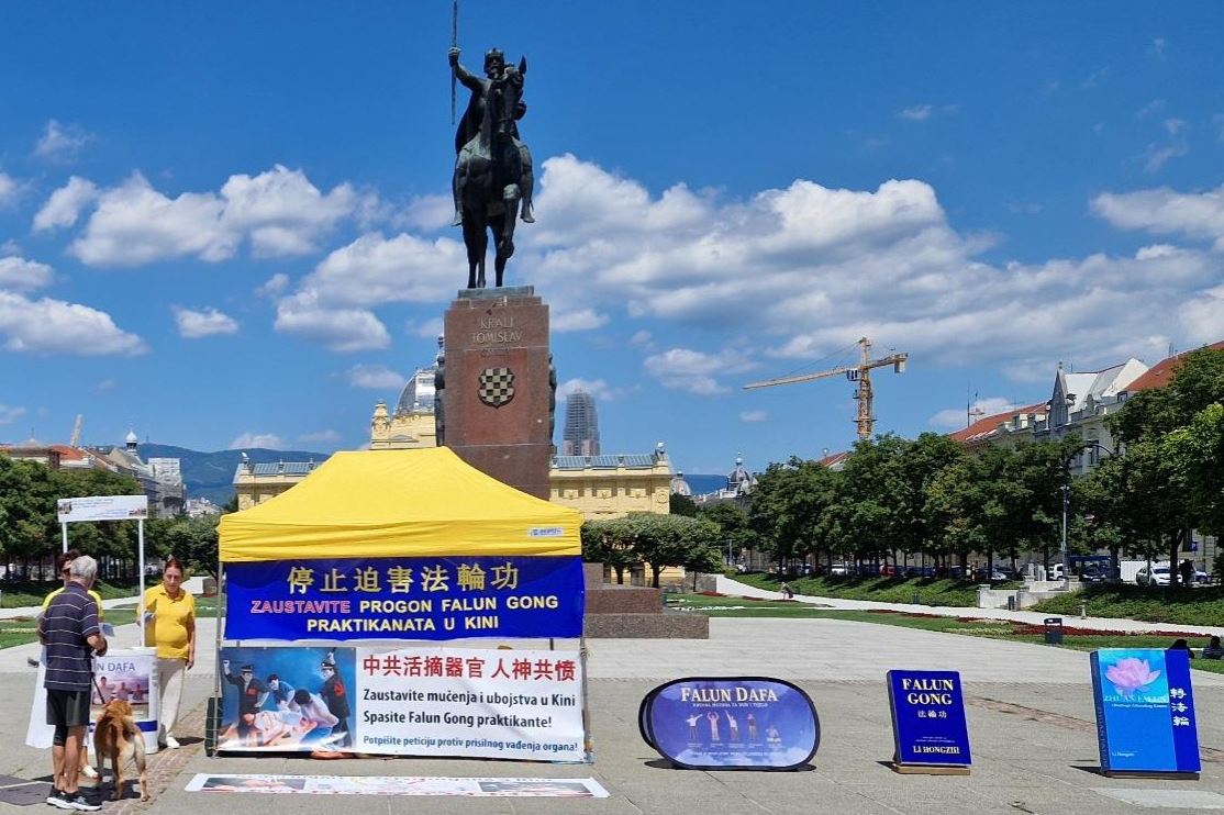 上午九点多,当地法轮功学员在市中心托米斯拉夫国王广场(King Tomislav Square)布置好展台。醒目的黄色帐篷和蓝色横幅,让行人远远就能看到横幅上的中克双语:“停止迫害法轮功”。
