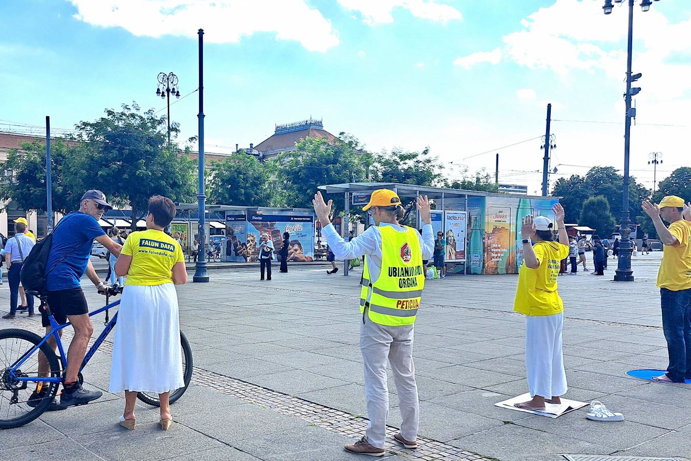 图1:二零二五年七月十九日,克罗地亚法轮功学员在首都萨格勒布(Zagreb)举办反迫害二十六年活动,法轮功学员向过往的市民展示功法。