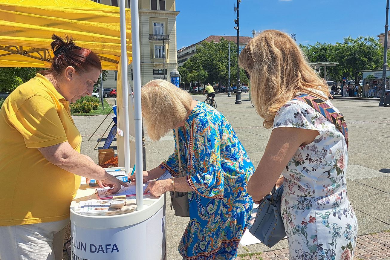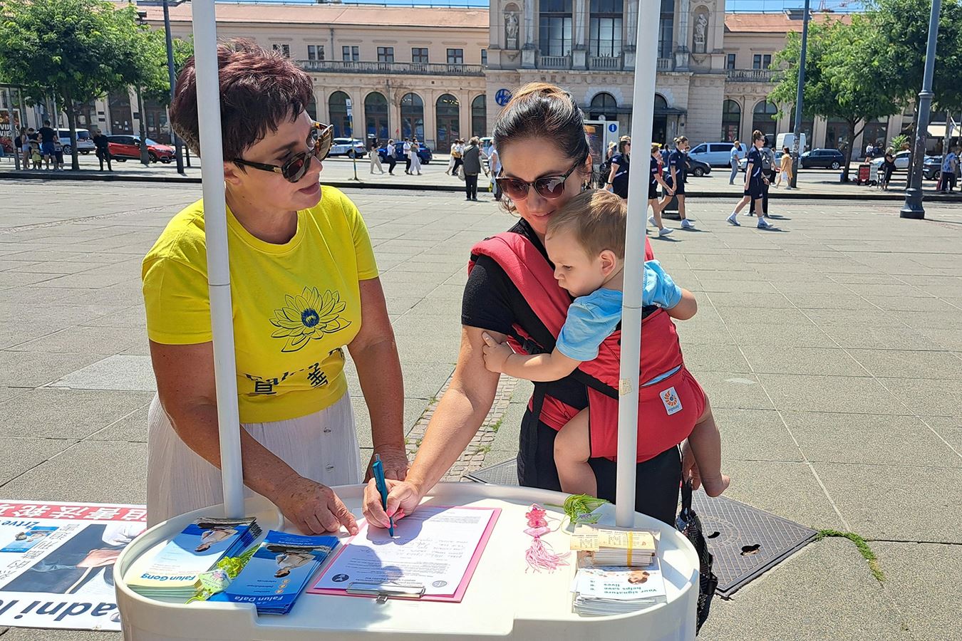 很多行人看到法轮功真相横幅后,直接走到信息台询问如何支持反迫害。背带托着小婴儿的教师纳迪娜(Nadina)就是其中一位,学员告诉她签名的地方。她立即到征签处签名,她告诉学员:“就是应该签名声援,停止这种迫害。”