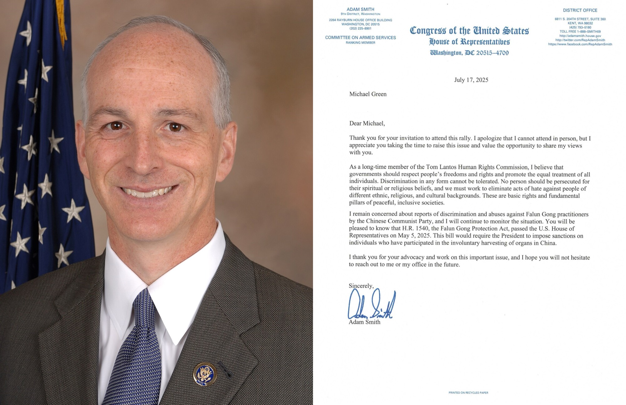 美国曼哈顿军事委员会首席委员、华盛顿州民主党联邦议员亚当·史密斯在写给法轮功学员的支持信中写道:“作为汤姆兰托斯(Tom Lantos)人权委员会的长期成员,我确信政府应尊重人民的自由和权利、促进一切个体的平等待遇。任何形式的歧视都不应被容忍。任何人都不应因其精神或宗教信仰而遭受迫害,我们必须努力消除针对不同种族、宗教和文化人士的仇恨行为。这些都是基本权利,也是政府尊重社会的基柱。”