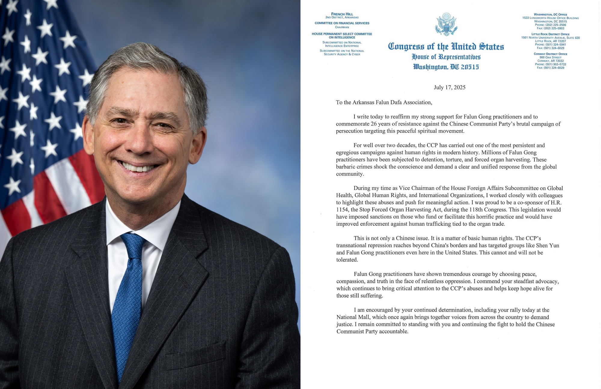 阿肯色州共和党联邦众议员法兰奇·希尔赞赏法轮功学员在过去二十六年里对中共迫害的反抗。“法轮功学员面对残酷无情的压迫,选择了和平、慈悲与真相,展现了巨大的勇气。我赞扬你们坚定不移的主张,这使人们持续关注中共暴行,并帮助那些仍在苦难中的人们保持希望。”
