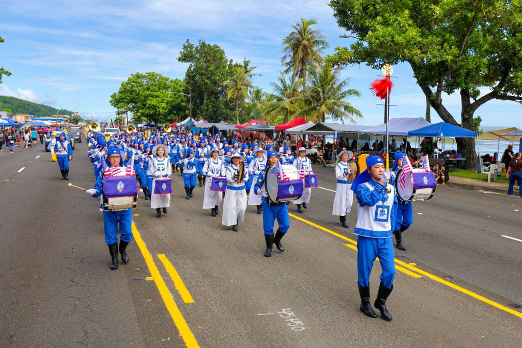 天国乐团的学员们身穿鲜艳唐装、头戴传统帽饰、脚踏黑色长筒皮鞋,动作整齐划一;后面是日本法轮功学员组成的腰鼓队,关岛当地学员也沿途发送大法的真相传单。