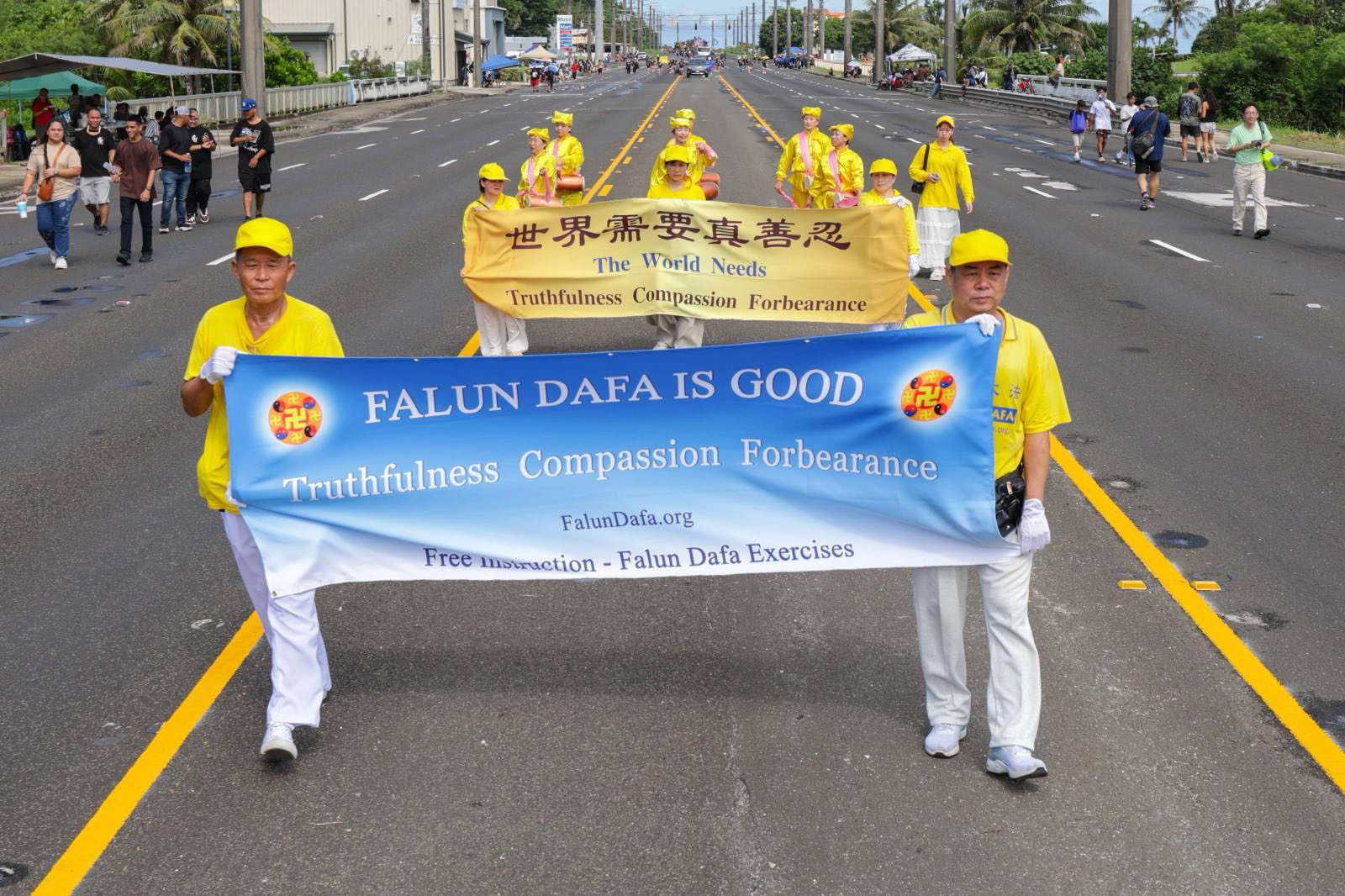 今年天国乐团是第三度参加关岛解放日庆典活动,阵容更胜以往,来自台湾和日本的法轮功学员们组成的天国乐团和腰鼓队伍参加了本次游行,备受瞩目。