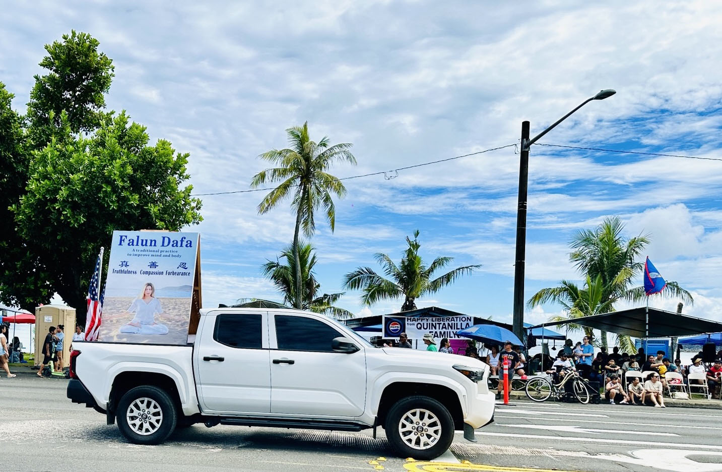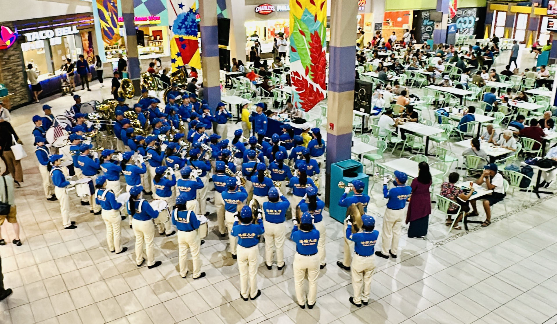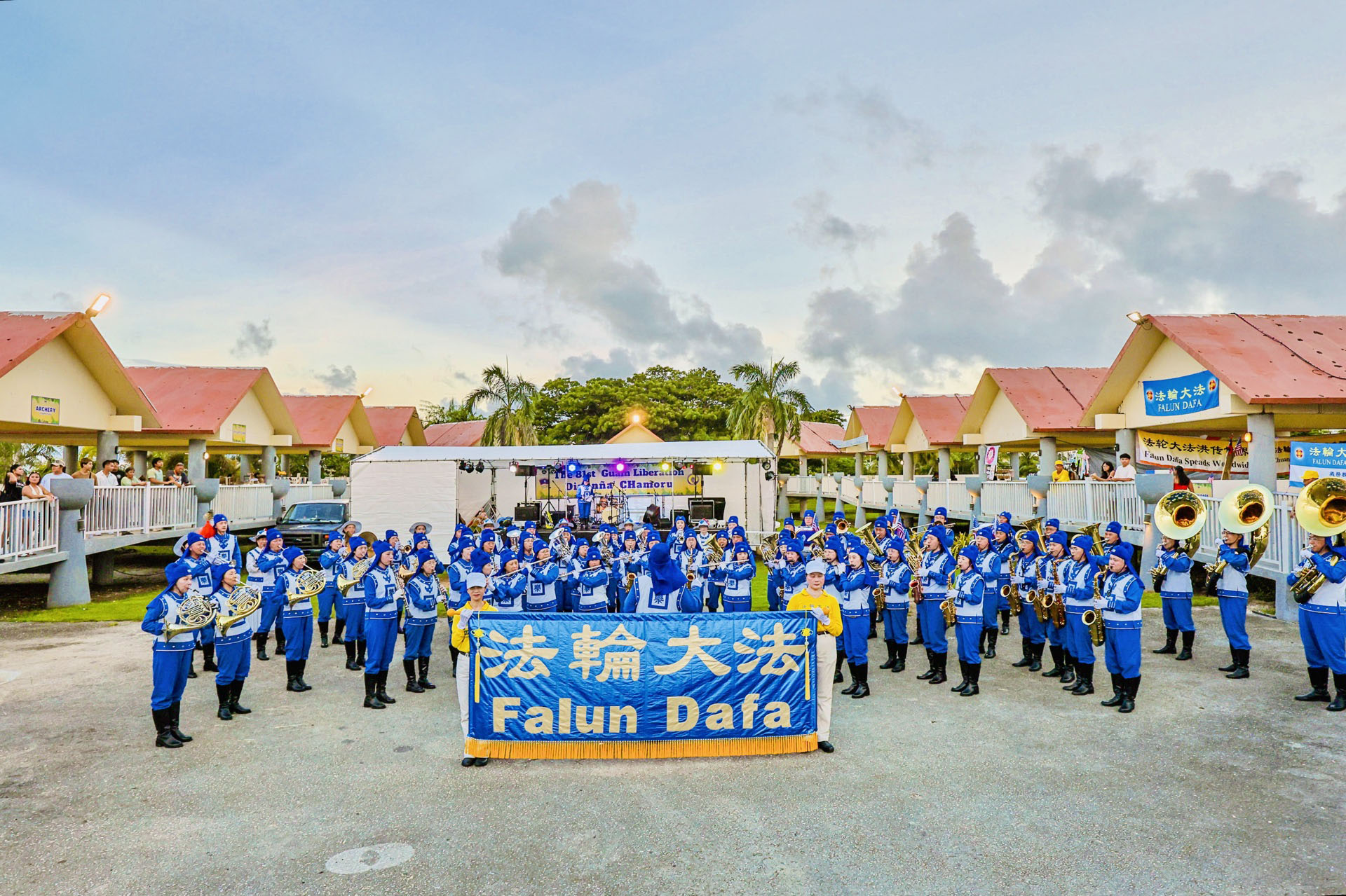 天国乐团游行至观礼台时,特别停下,面向司令台演奏了象征美国精神的《星条旗永不落》进行曲,向关岛总督、现场贵宾及民众献上诚挚的祝福。司令台上的总督及贵宾们也热情挥手致意,表达对远道而来的天国乐团的感谢与赞赏。此时,现场主持人也热情介绍法轮大法与乐团背景。整体演出不仅展现艺术水准,更传递真、善、忍的精神理念,深受现场观众与媒体好评。此外,当地学员也上台分送法轮大法的简介资料。