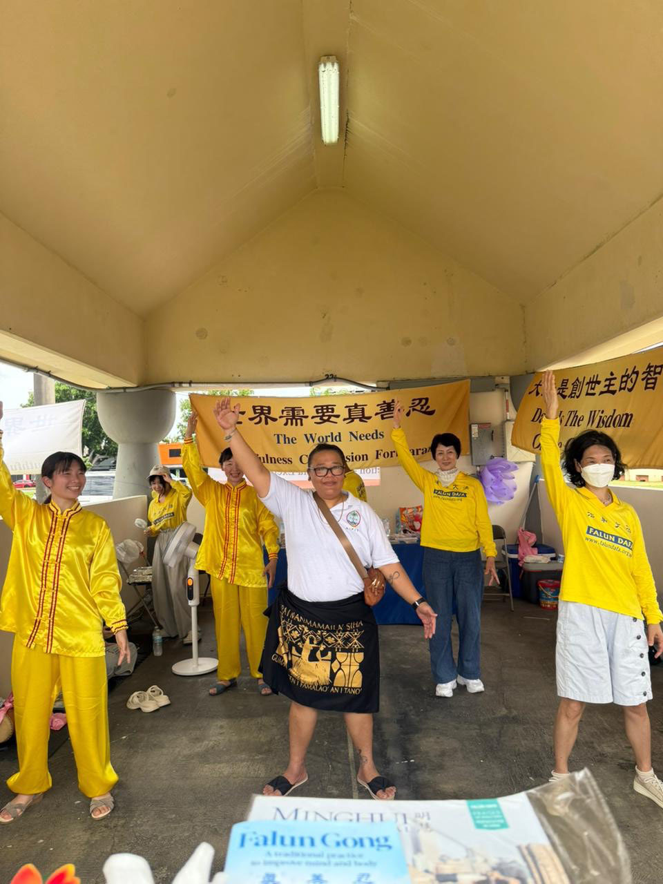 娜塔莉主动前来询问,并表示这套功法非常优美祥和。经过详细介绍后,她深受法轮功所传递的平静与正向能量感动,并邀请天国乐团前往她们家族经营的关岛知名景点“恋人岬”(Two Lovers Point)进行功法展示,让更多游客有机会了解法轮功。