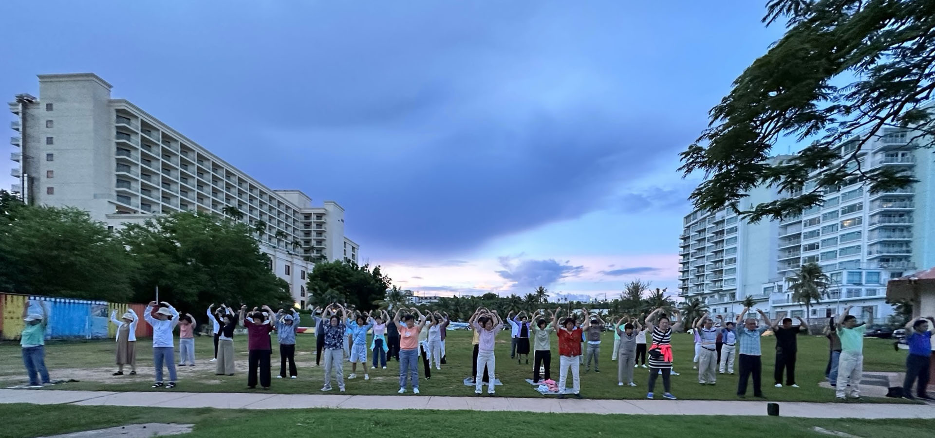 ![]() 图11:七月二十二清晨,数十位来自台湾与日本法轮功学员在马塔潘海滩上的公园晨炼 |