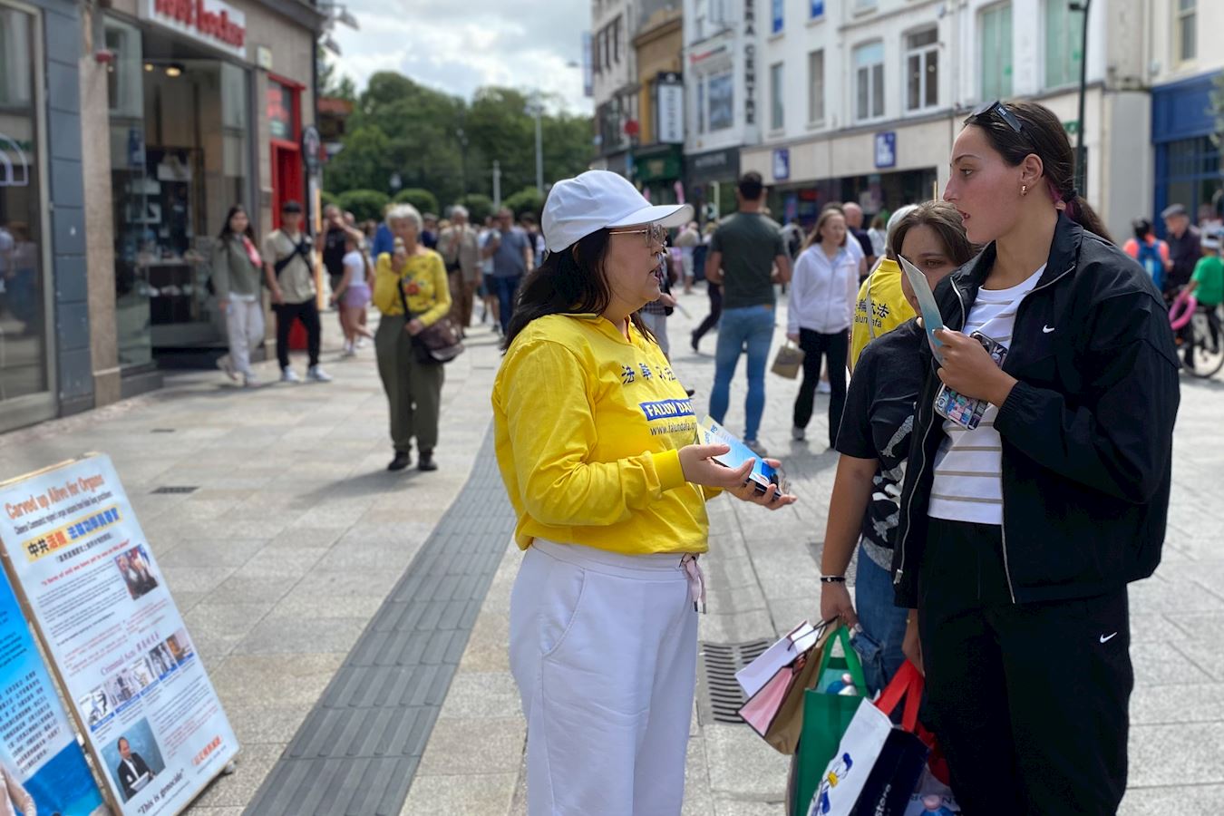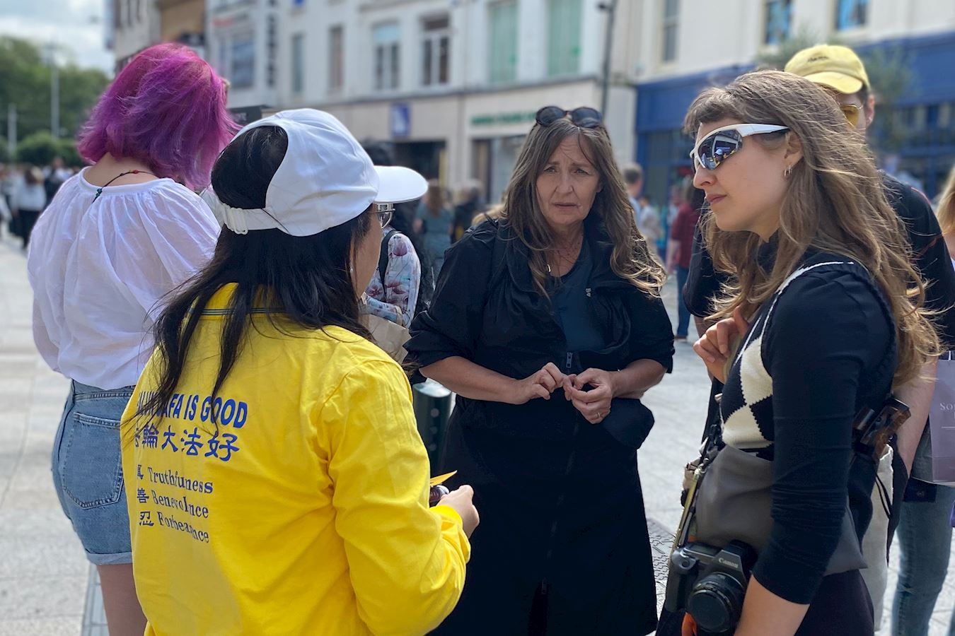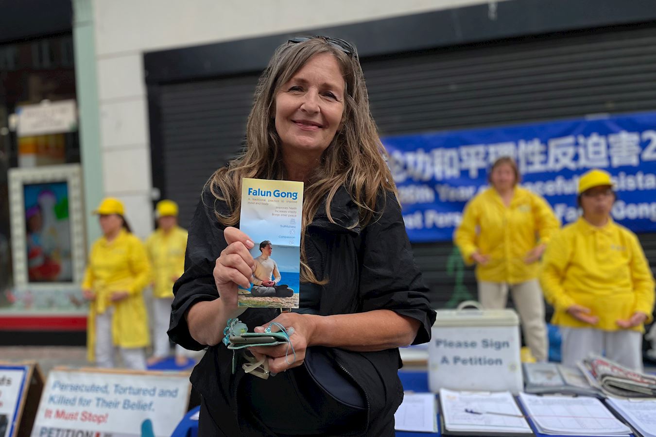艾琳(Eline)说她曾在网络上了解到中共在迫害法轮功,所以想签名帮助制止迫害。艾琳说她自己看到抵制迫害、战争的活动,总是想尽一份力,即使时间匆忙,也会竖起大拇指,表达支持。说话间,看到集体炼功的学员,艾琳感叹道,“你看他们多祥和啊,我觉得这功法太棒了!”
