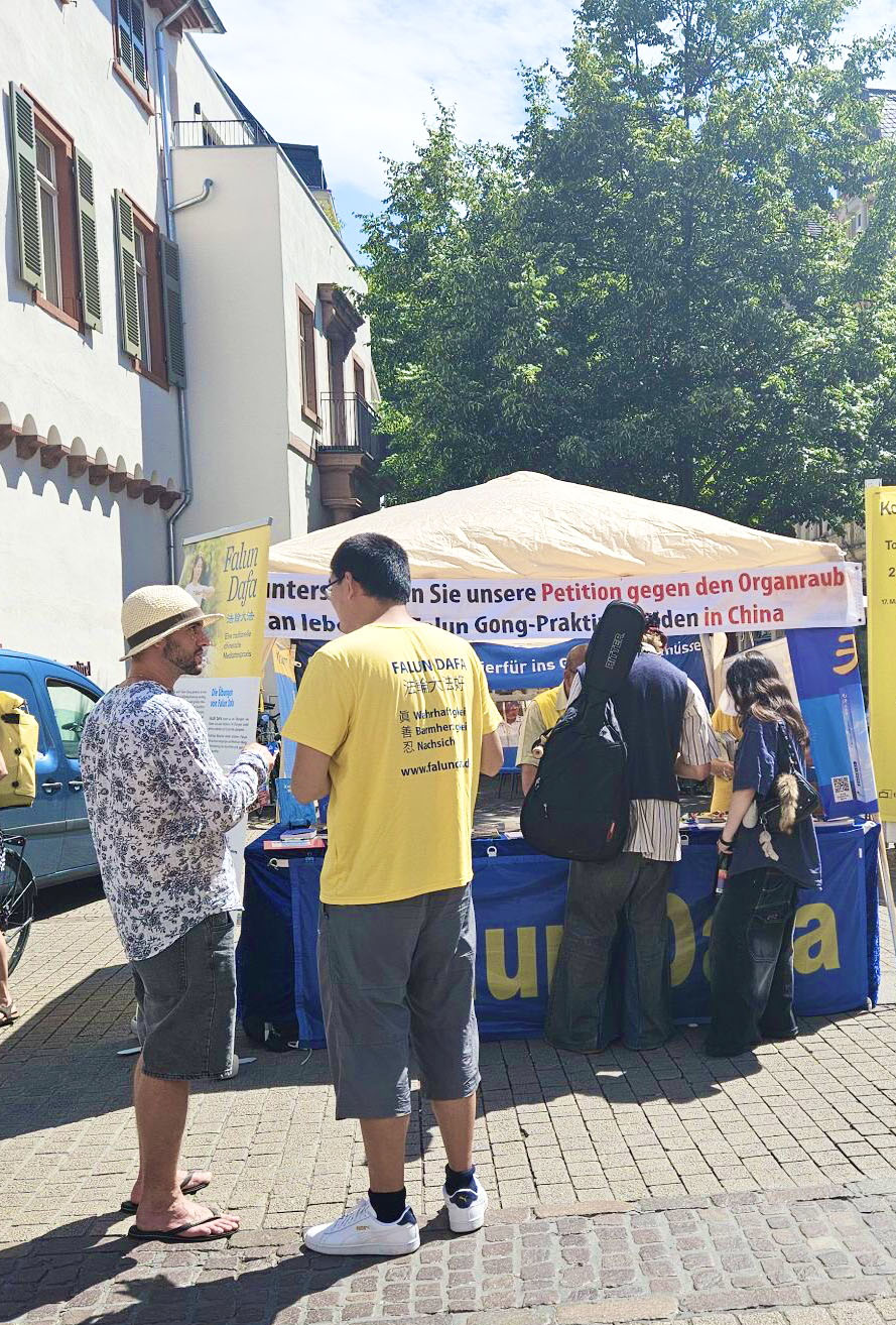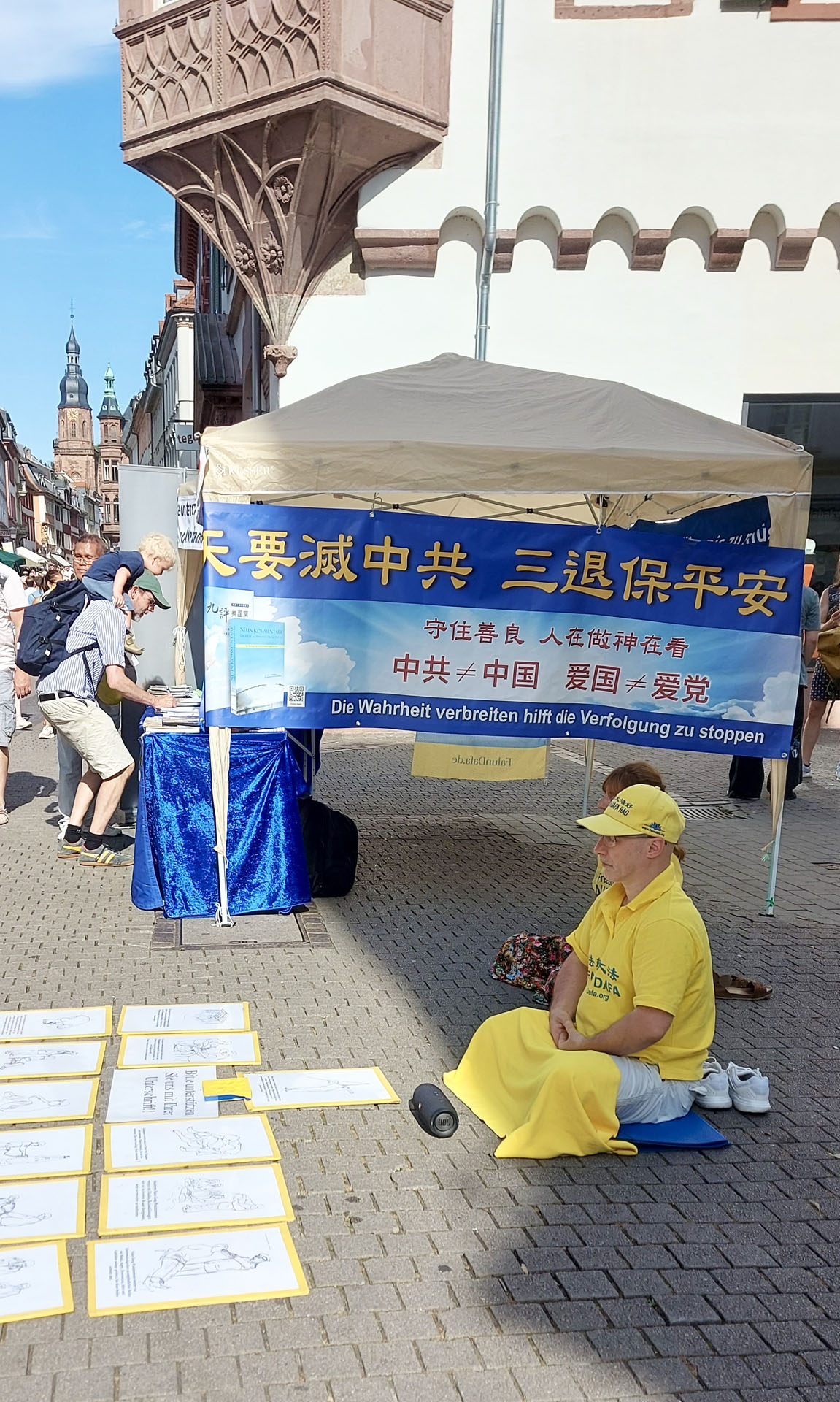 ![]() 图1:二零二五年七月五日, 德国法轮功学员在海德堡剧院广场(Theaterplatz)征签反迫害。图为法轮功学员在炼功。 |