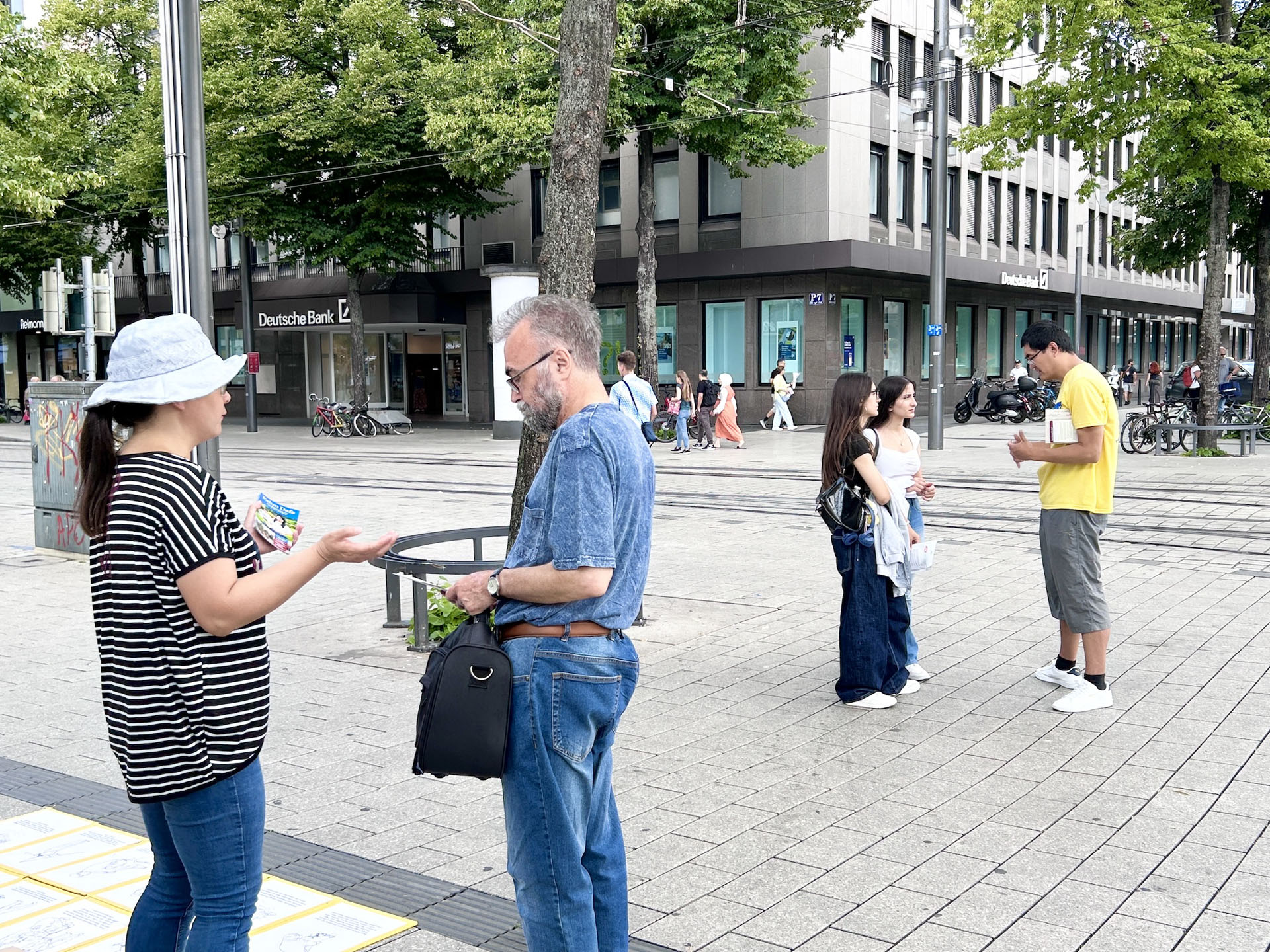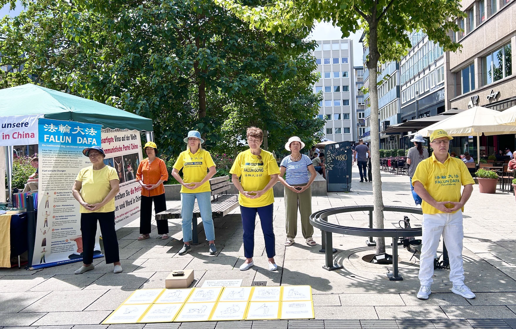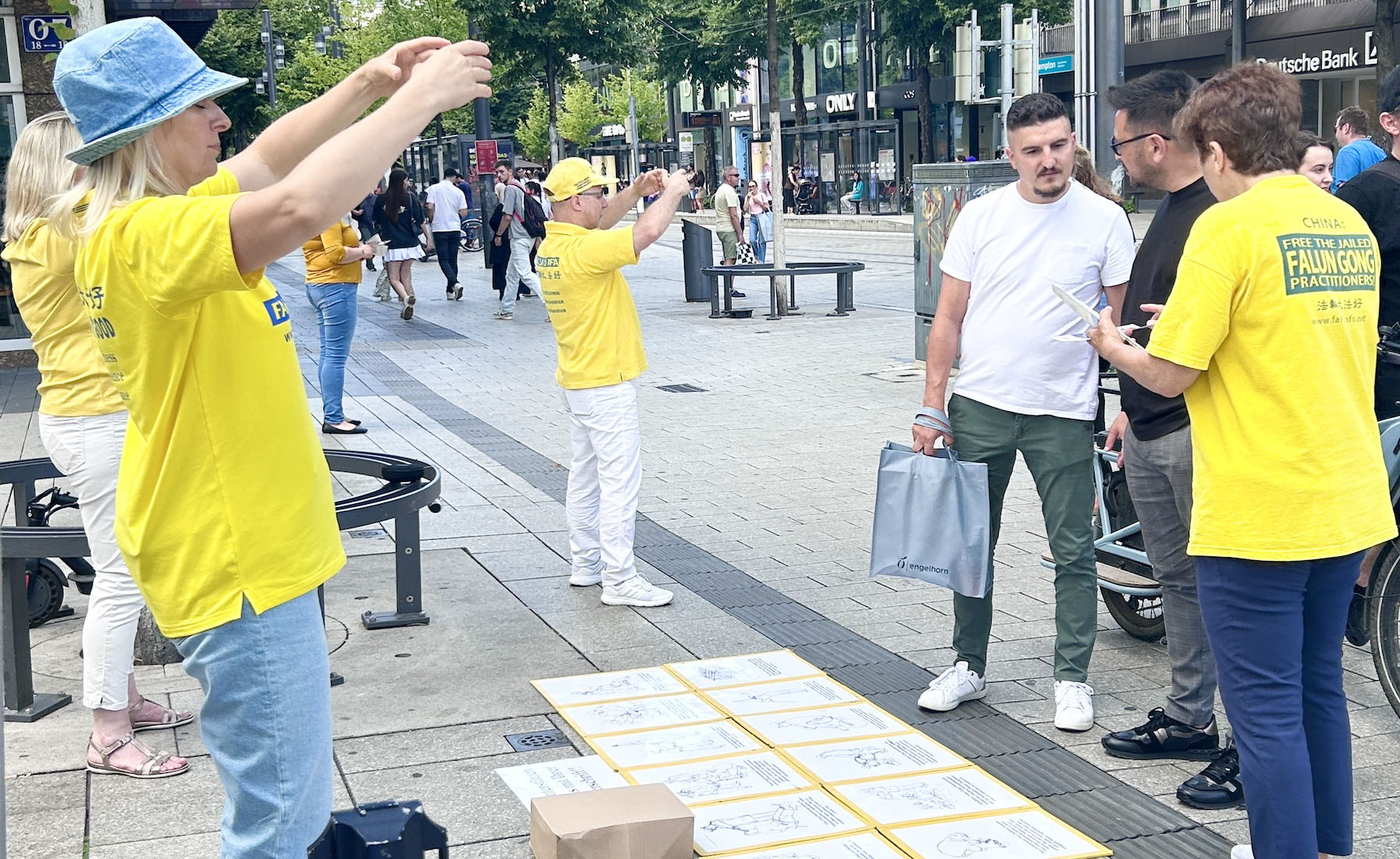 ![]() 图2:二零二五年七月二十六日, 德国法轮功学员在曼海姆水塔(Wasserturm)对面步行街弘法,反迫害。图为学员在向路人演示功法。 |