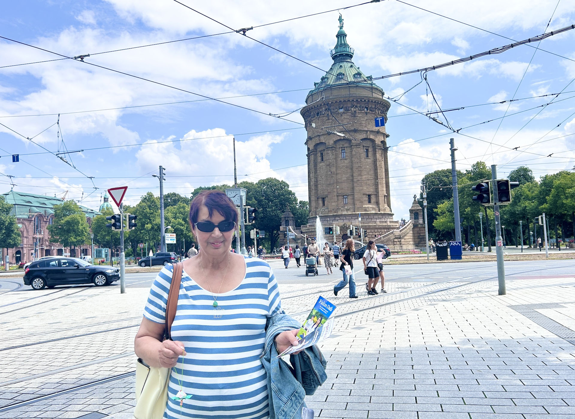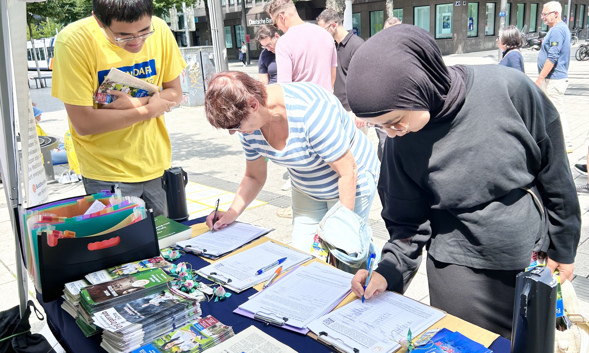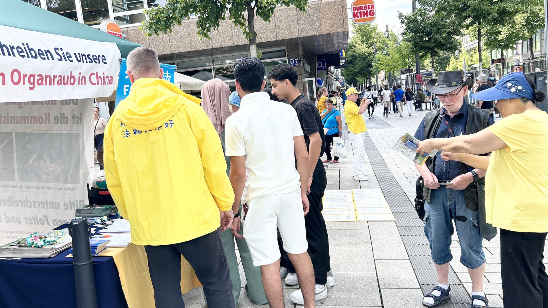 ![]() 图2:二零二五年七月二十六日, 德国法轮功学员在曼海姆水塔(Wasserturm)对面步行街弘法,反迫害。图为学员在向路人演示功法。 |