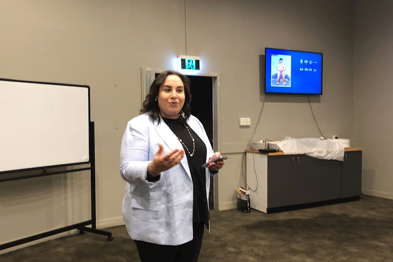 ![]() 图2:市议员珍妮弗・沃尔瑟女士正在法轮功免费教功班上演讲。 |
