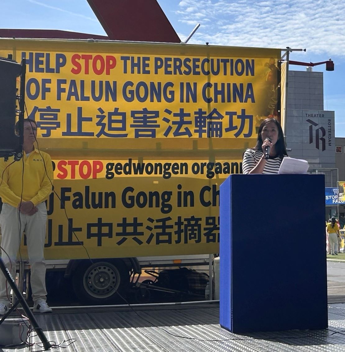 活动开始的集会上,荷兰法轮大法佛学会负责人王家恩(KaYan Wong)女士发言,她指出:“法轮大法自一九九二年传出,以真善忍为原则引导修炼者强身健体,做一个善良的人,在短短几年间有上亿人追随真善忍,由此而被中共忌惮。自一九九九年以来,无数无辜的法轮功学员被任意拘留,并遭受酷刑和其他虐待,强迫放弃精神信仰,以致活摘法轮功学员器官牟利的罪恶,桩桩件件记录在案。中共的迫害延伸到海外,威胁恐吓无恶不作。多年来有各国政府要员为反对中共迫害法轮功发声,此次国际特赦组织呼吁停止对法轮功学员的任意迫害。”王家恩要求:“中国当局必须立即停止迫害,释放所有被监禁的法轮功学员。”