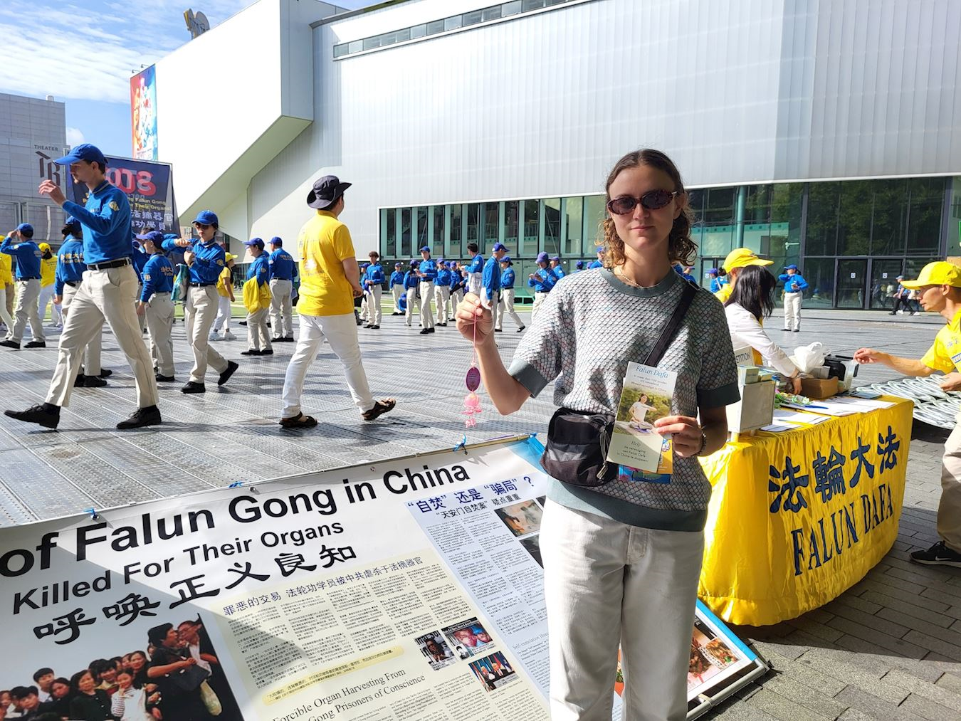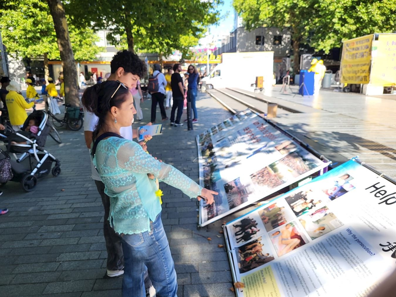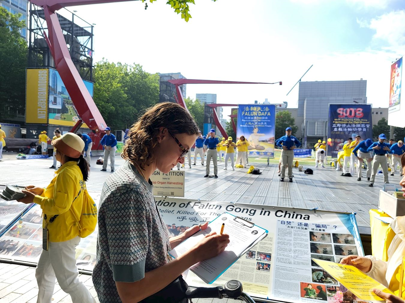 塞尔达(Zelda)在活动展板上看到迫害相关信息后主动上前询问,并签名支持反对活摘器官。她表示自己此前并不了解这一情况,但在看到相关照片后感到震惊和恐惧。“我无法想象这种事情真的在发生,太可怕了。”她说。学员向她介绍了法轮大法“真、善、忍”的核心原则,塞尔达对这一理念表示赞赏,称这些价值观“很美好,最好通过行动来体现他们。”