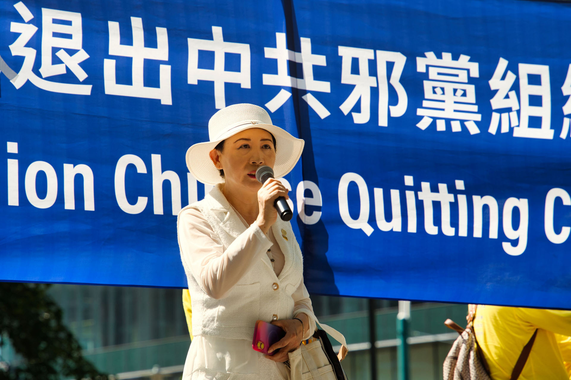 民阵加拿大分部副主席盛雪女士,在集会上首先对法轮功学员发起的三退(退出中共党、团、队)活动表达了赞赏:“毫不夸张地讲,(三退)是人类历史上最伟大的自救运动。”她表示,中共让中国人失去善良、正义和人性,最终变成“共产人”,而法轮功学员给了民众一个选择:让自己从专制血腥的暴力机器上拆卸下来,成为真正的人。