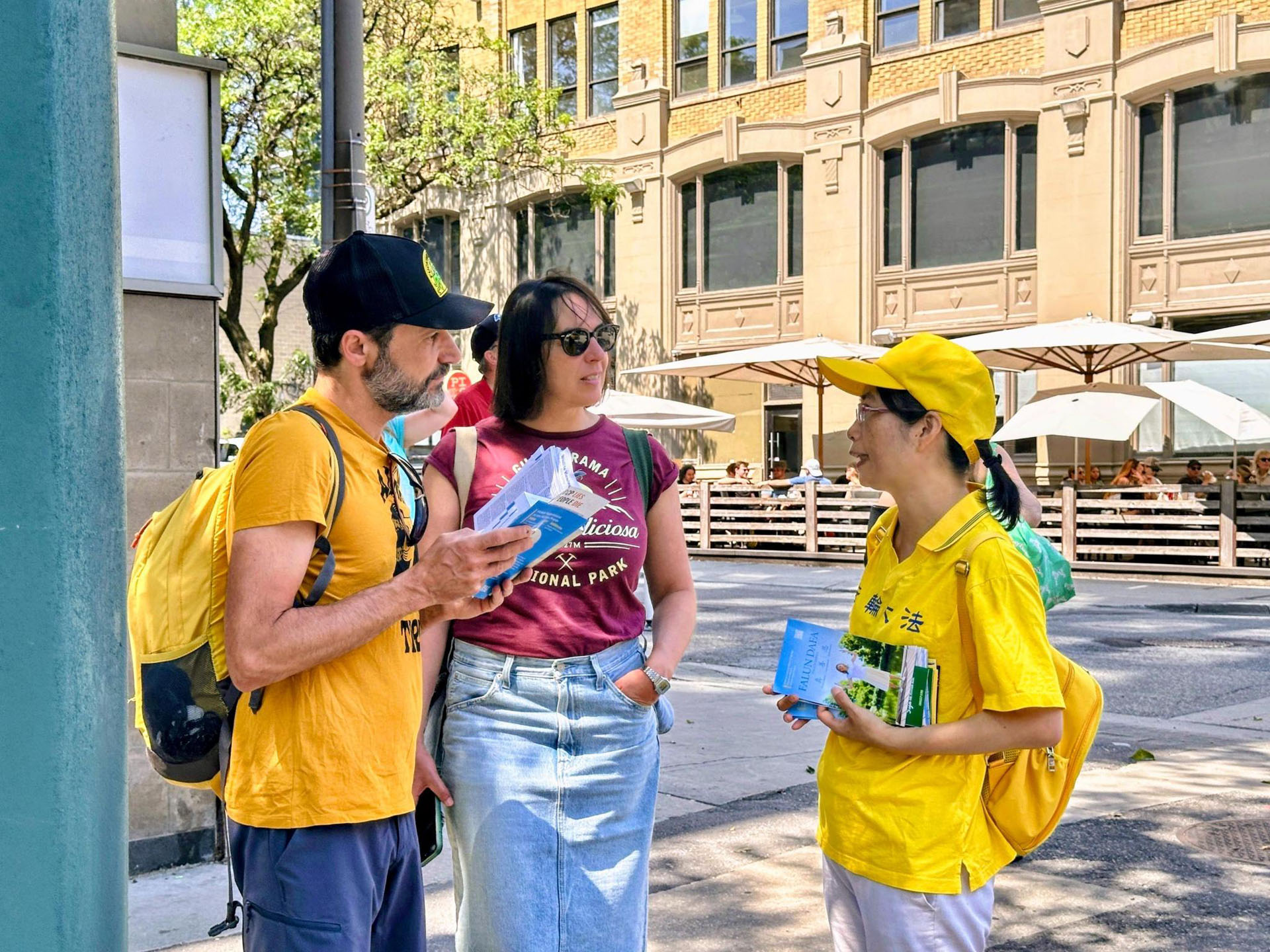 艾米丽(Emily)是一名法律辅助人员,她指着传单说:“我曾经见过一些法轮功学员在公园里炼功,我认为真、善、忍的理念对人是很重要的。”