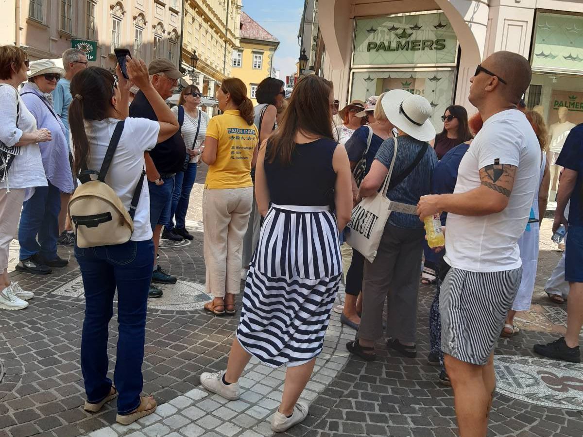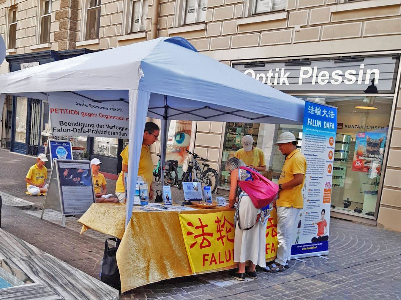 法轮大法真相展位设立在当地著名的“沃尔特湖之神”(Wörtherseemandl)纪念碑旁。沃尔特湖之神是卡林西亚州的一位神话人物,相传是他创造了沃尔特湖。该纪念碑是游客团、带孩子的度假家庭和当地居民在步行区的热门目的地。旁边的法轮大法真相展位为人们了解法轮大法的美好,以及二十六年来大法修炼者和平理性揭露中共非法迫害,提供了绝佳机会。