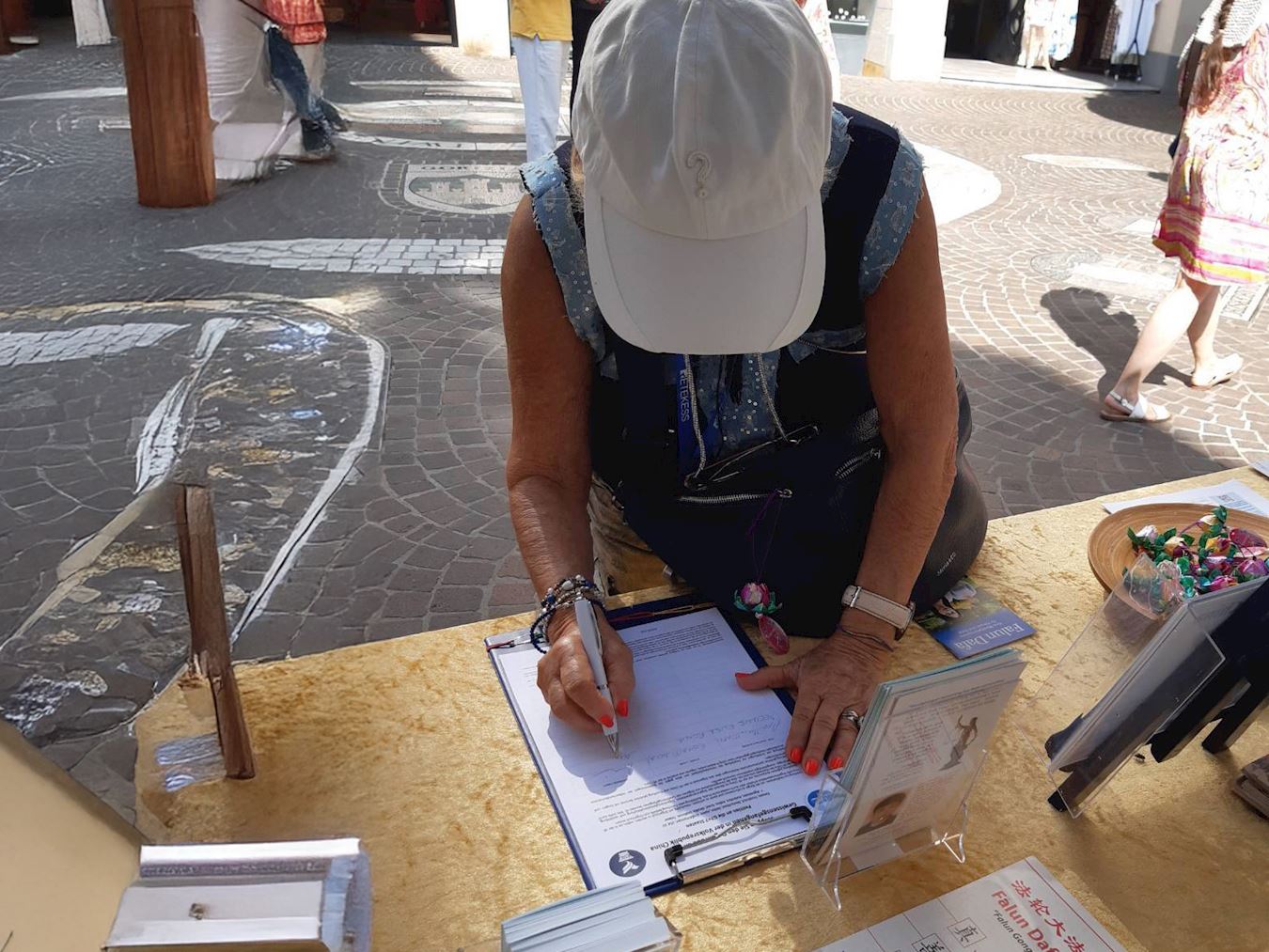 一位导游向她来自罗马的游客团翻译了真相横幅上的内容。随后,几位来自罗马的女性游客在呼吁停止迫害的请愿书上签了名。这位导游从展位上拿了很多真相传单,她希望尽自己所能呼吁停止在中国进行器官活摘。