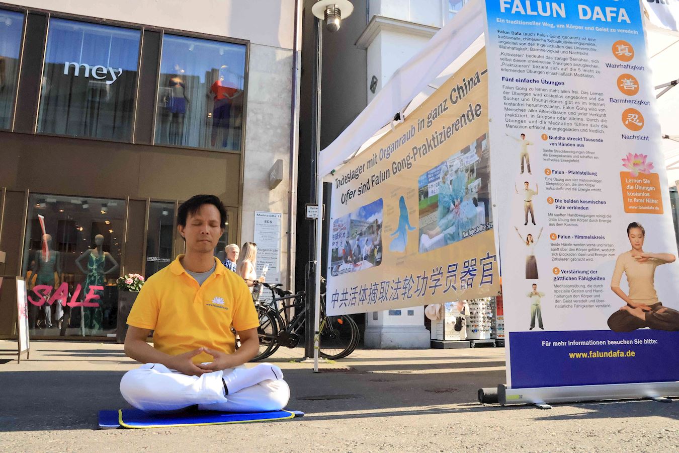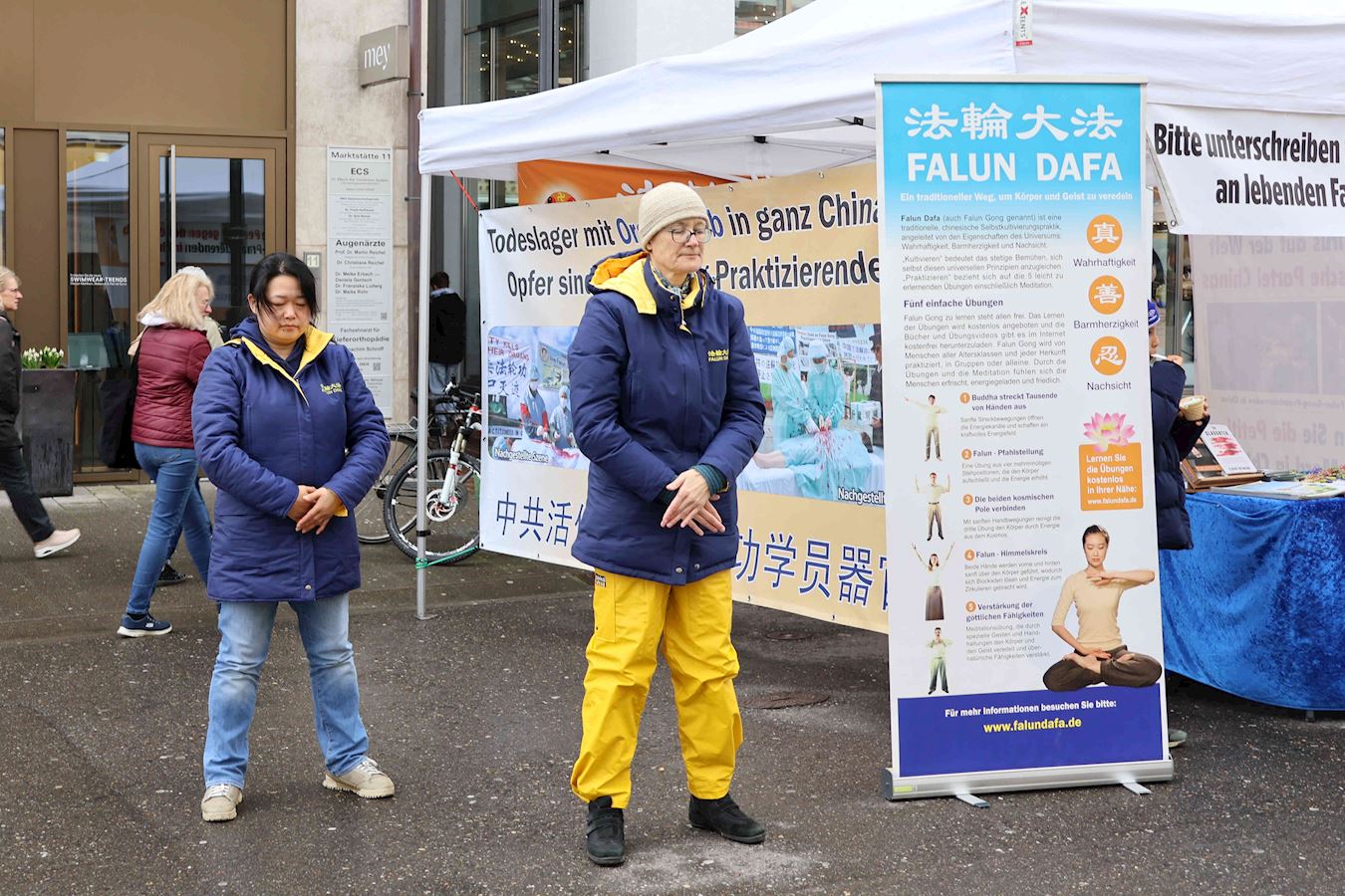二零二五年二月至七月的十五个周六,来自德国和瑞士的法轮功学员先后在康斯坦茨的轮渡码头及市中心马克特广场(Marktstätte)设立展位讲述法轮功的真相,很多人在得知中共残忍迫害法轮功二十六年之久,甚至活摘法轮功学员器官的罪恶后,纷纷签名希望共同制止中共的反人类罪行。