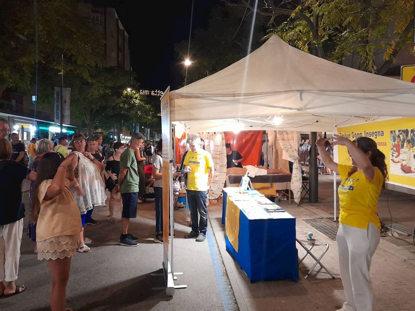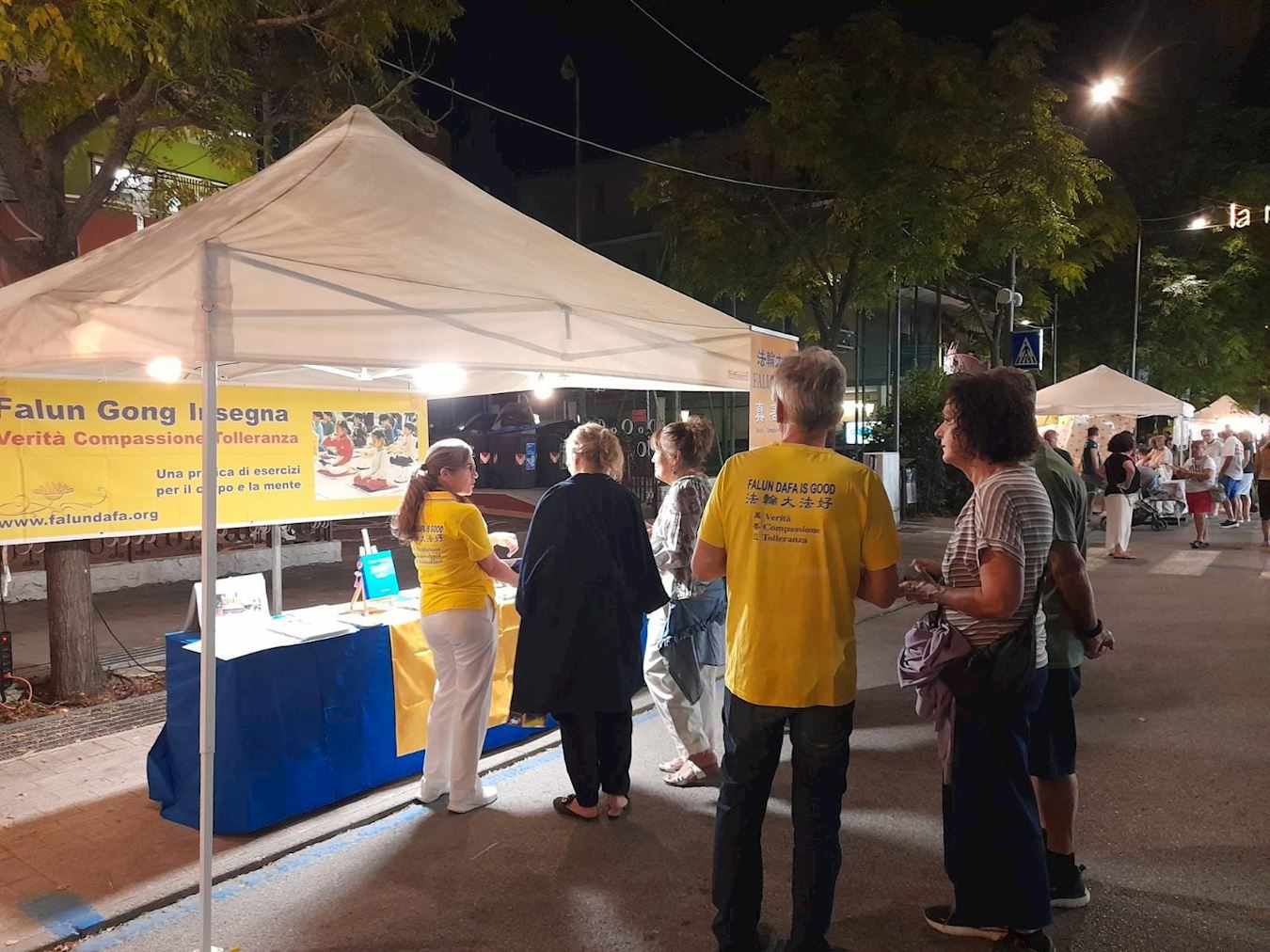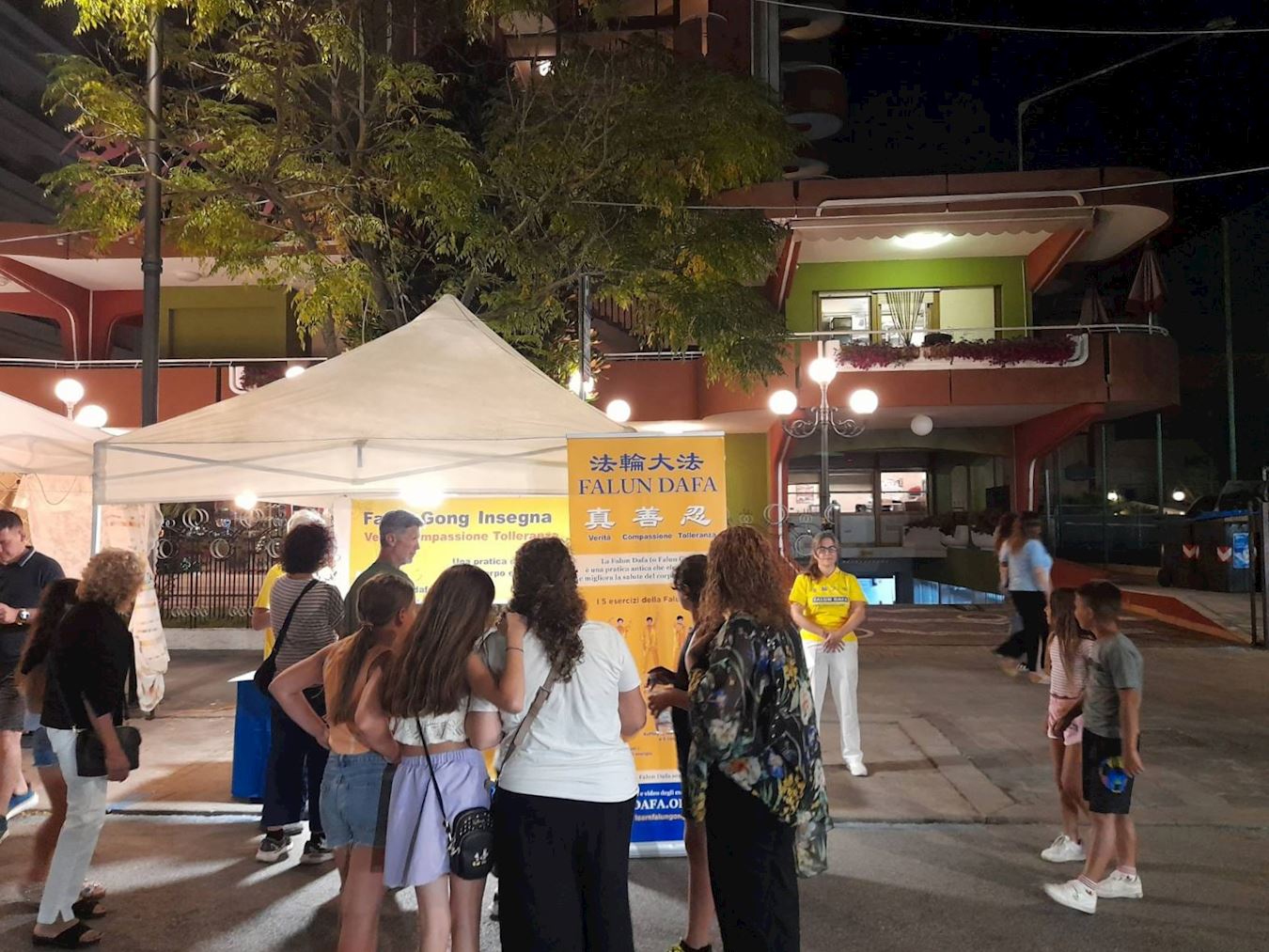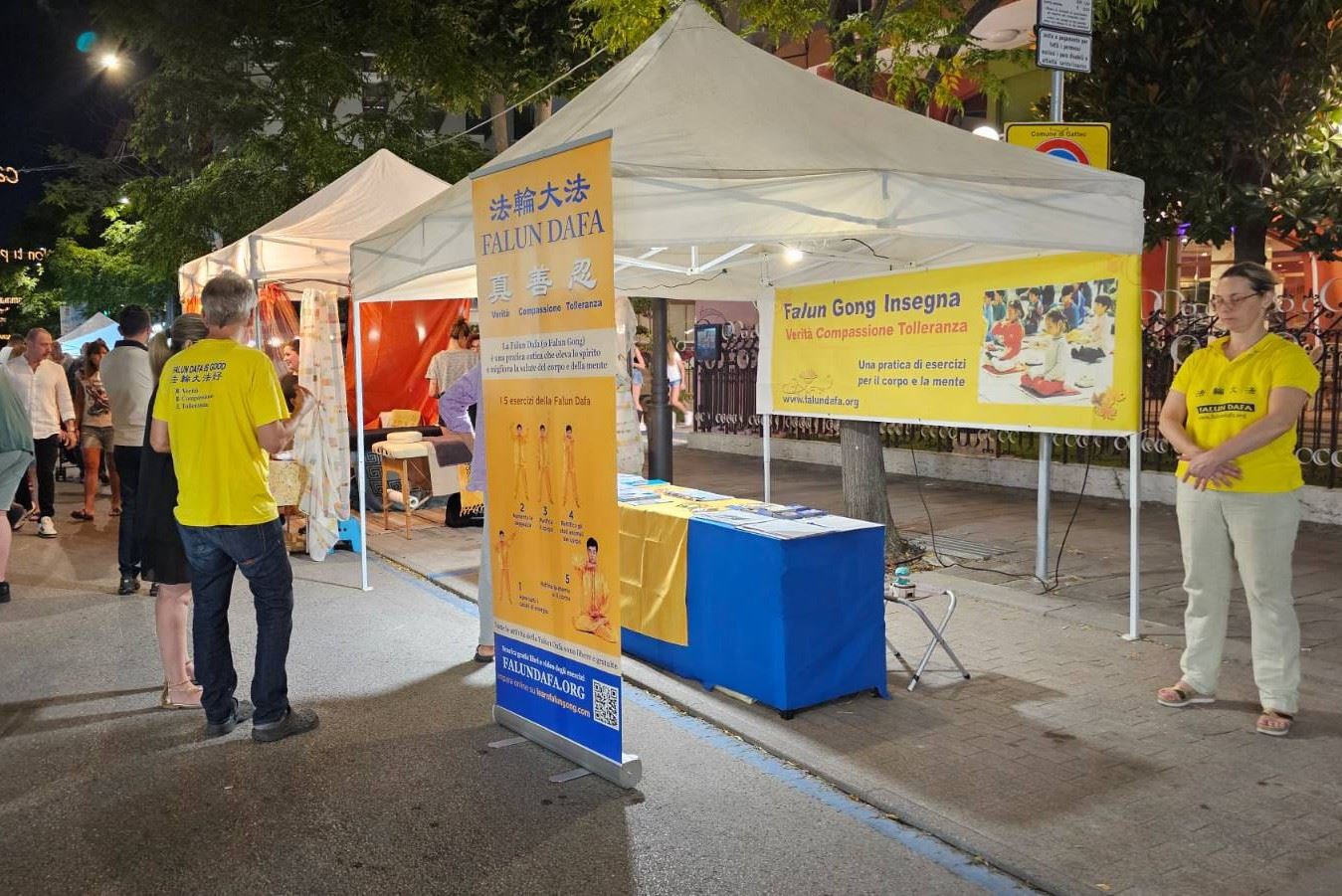 二零二五年八月七日傍晚至午夜,在意大利艾米利亚-罗马涅大区、与里米尼(Rimini)接壤的海滨旅游胜地(Gatteo Mare)的海滨大道上,法轮功学员参加了当地的“美好生活二零二五”健康展会“Good Life 2025”。活动主题是身心健康与和睦生活,聚集了众多有关身心灵产品展商与自然疗法从业者。法轮功学员向民众介绍了法轮功,演示功法动作,并呼吁民众关注中共持续迫害法轮功的真相。