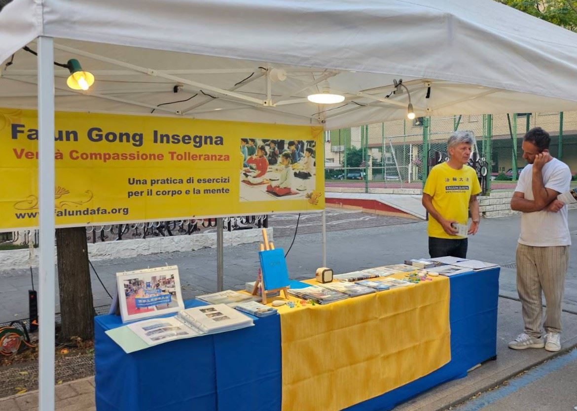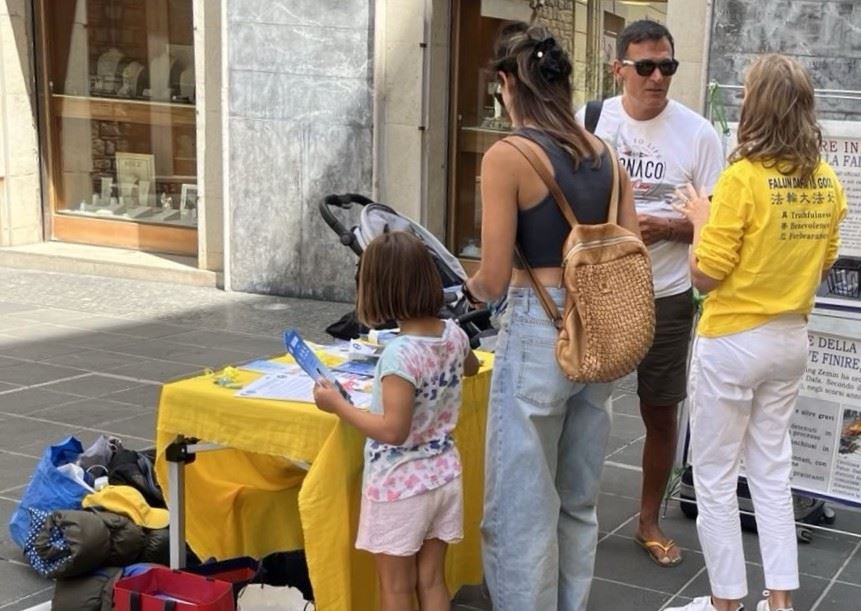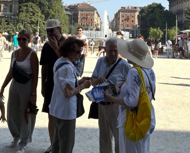 这一天是意大利夏日节,来往游客较多。法轮功学员陈列了法轮大法真相展示信息台,有不少行人过来接真相传单、并了解大法的美好。其中就有一对老年夫妇前来咨询。在听过法轮功的信息后,非常认同并說真、善、忍太好了,现在的人类社会就缺少这样的价值。他们继续询问哪里可以学功,并向学员询问米兰的炼功点,准备学炼功法。