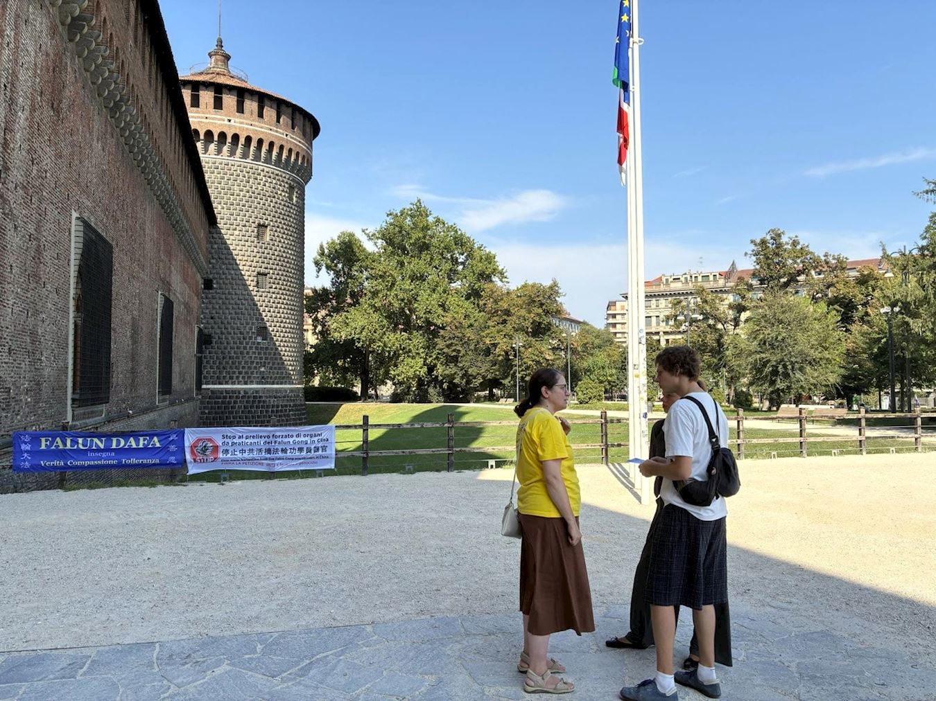 八月十五号,米兰(Milano)斯福尔扎城堡前(castello sforzesco)法轮功学员举办了讲真相活动、展示功法。