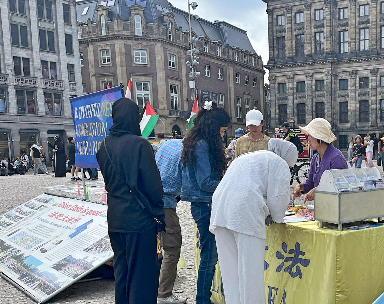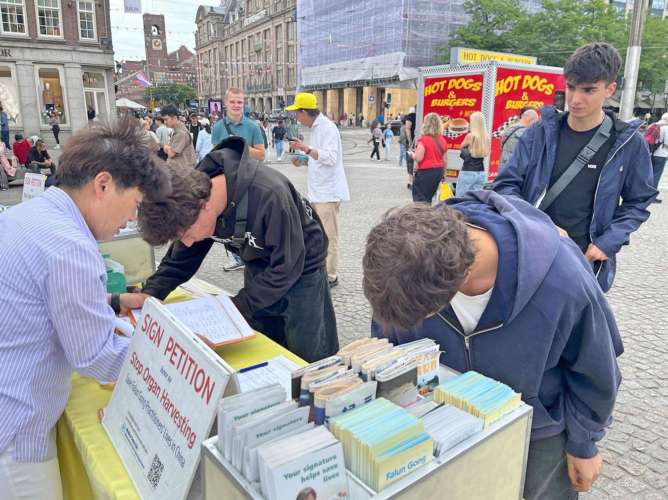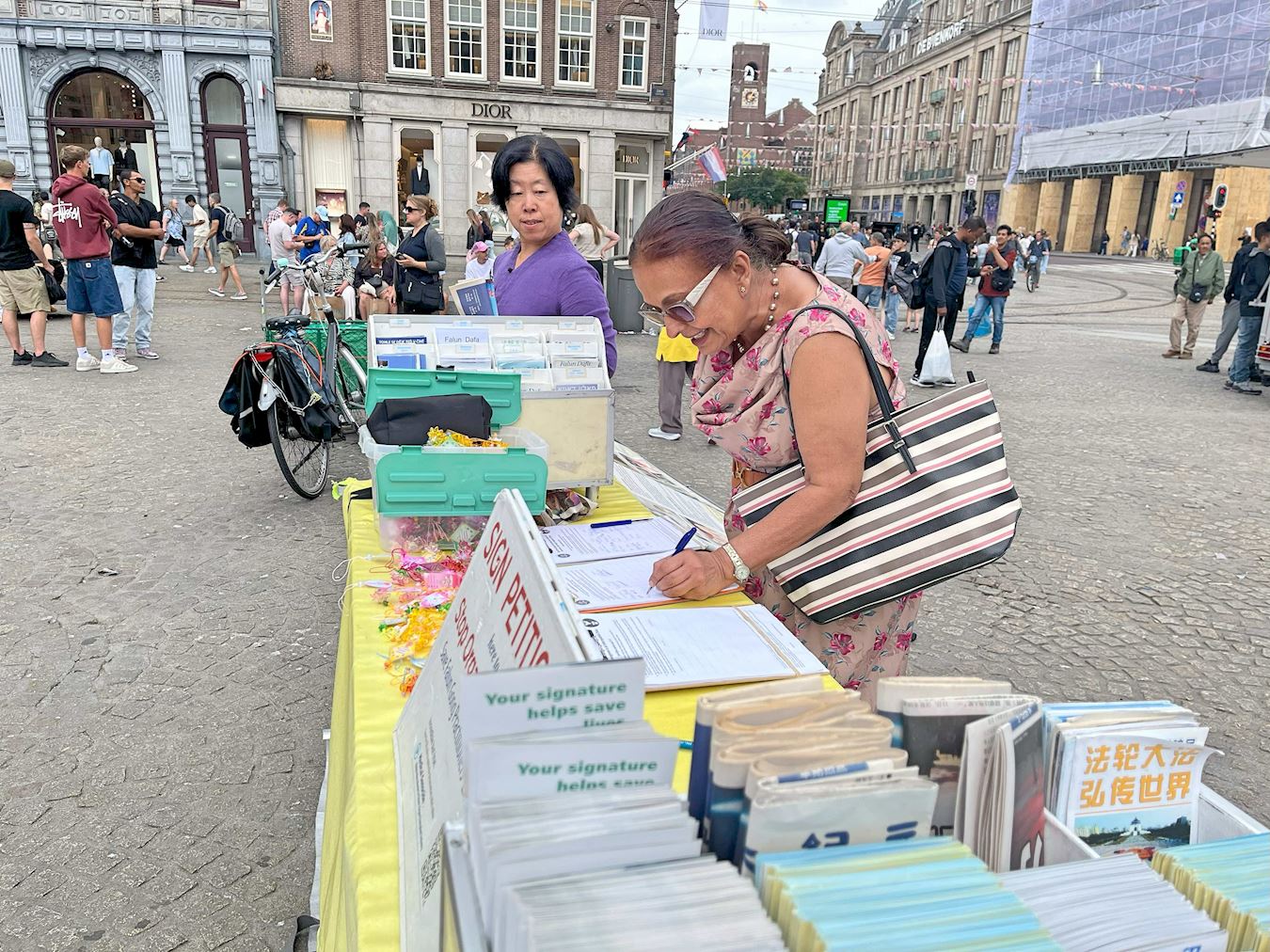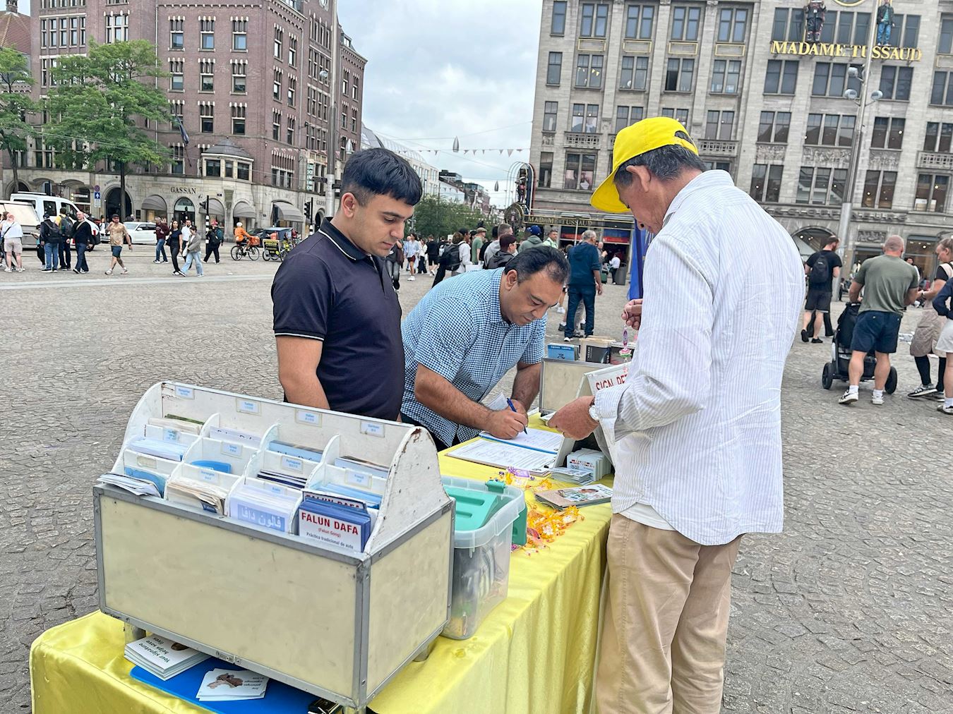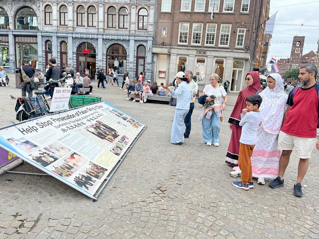 ![]() 图1:二零二五年七月二十五日, 荷兰法轮功学员在阿姆斯特丹市中心的达姆广场讲真相,来自中国和西方国家的游客停下脚步来了解法轮功及其在中国遭受迫害的真相。 |