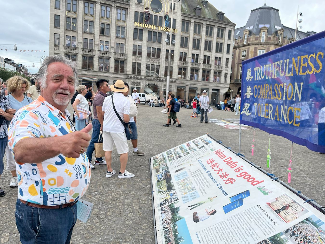七月二十五日,阿姆斯特丹的活动在市中心的达姆广场(Dam Square)举行,这里是热门的旅游观光和购物场所。学员们集体炼功,展示法轮功真相横幅,并与路人交谈。