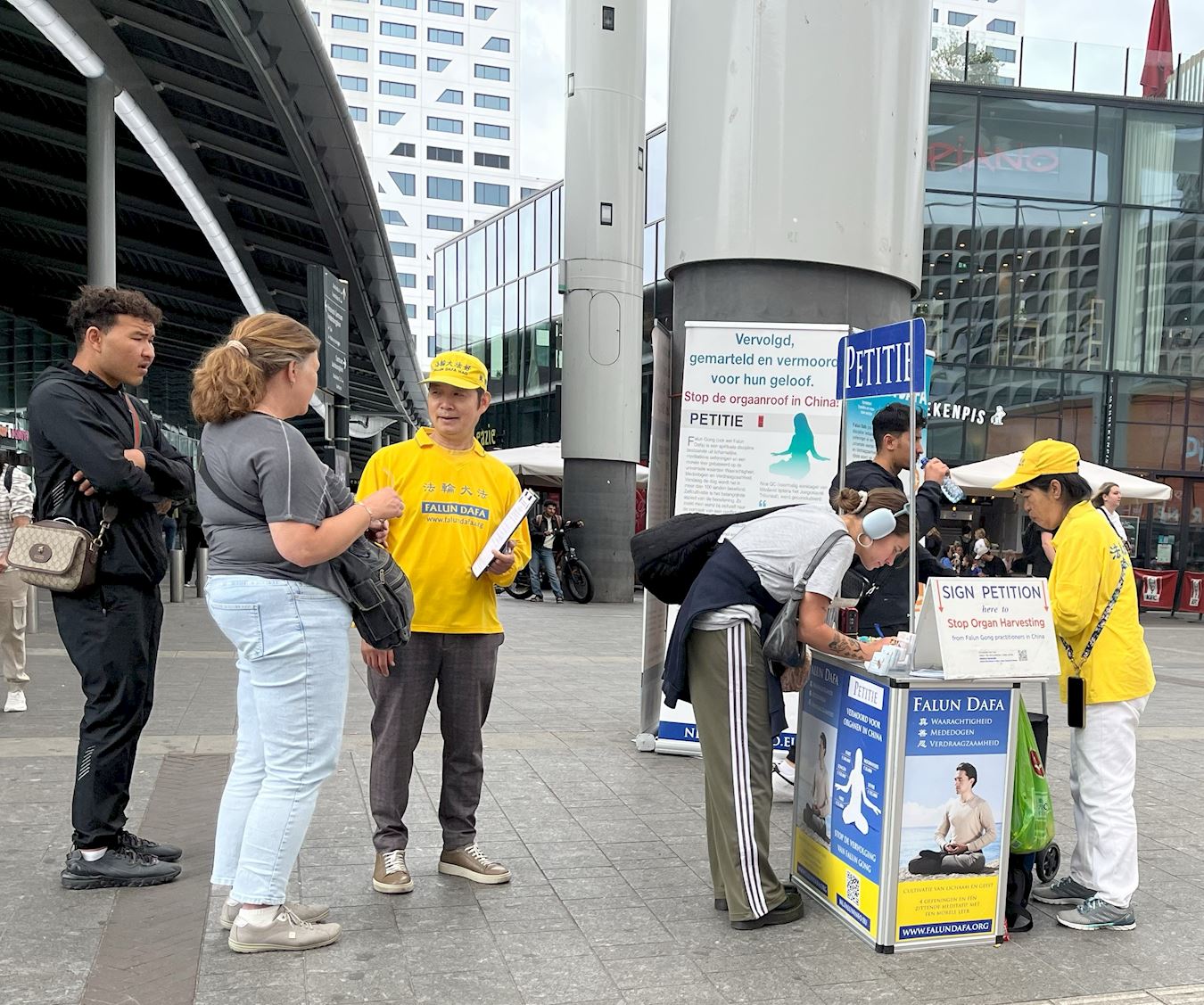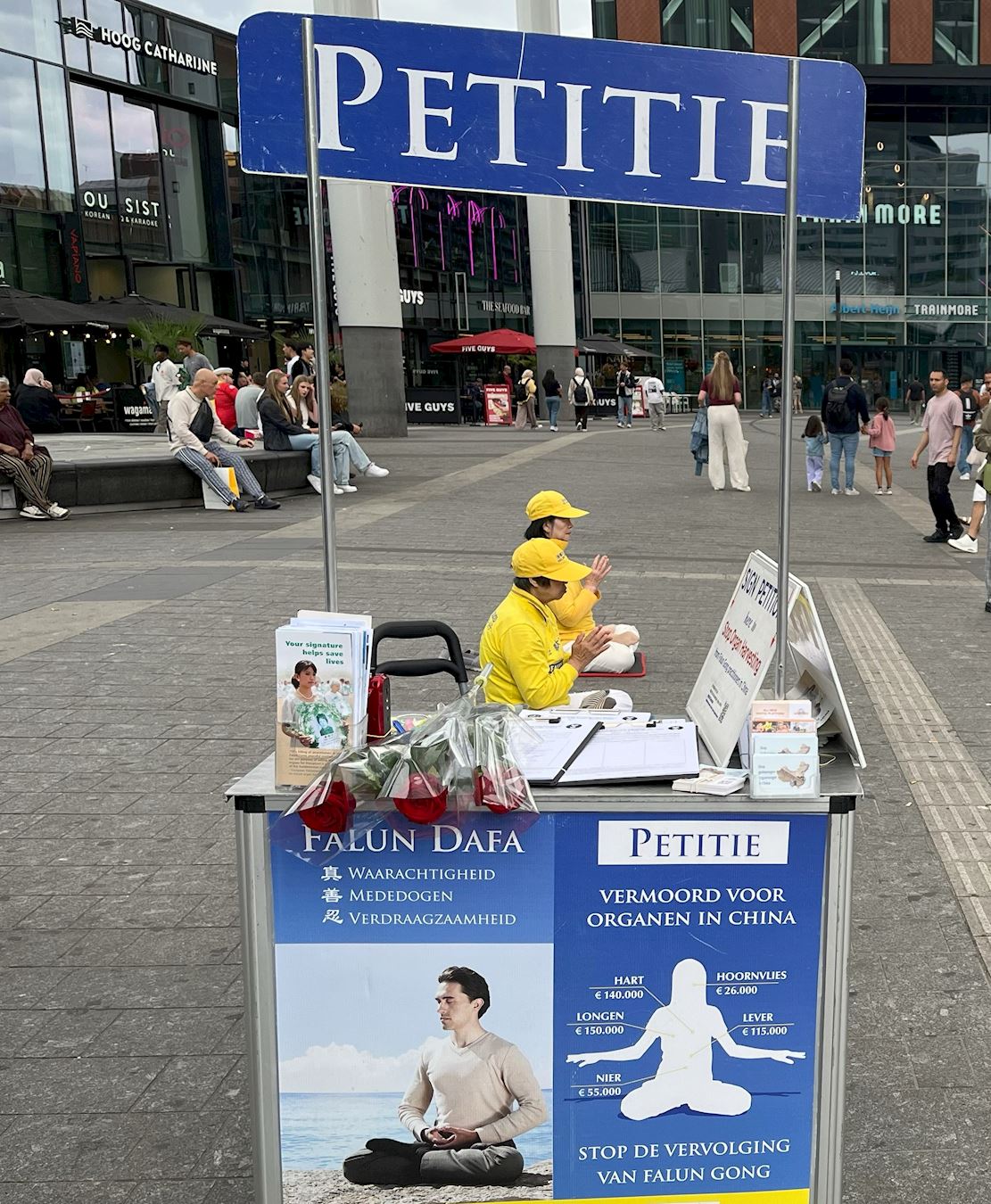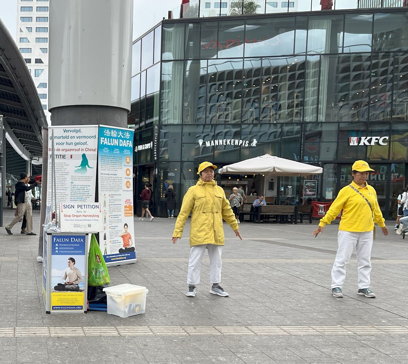 七月二十七日,在乌得勒支中央火车站与购物中心之间的广场,法轮功学员展示功法并向公众介绍他们在中国面临的迫害,包括活摘器官。