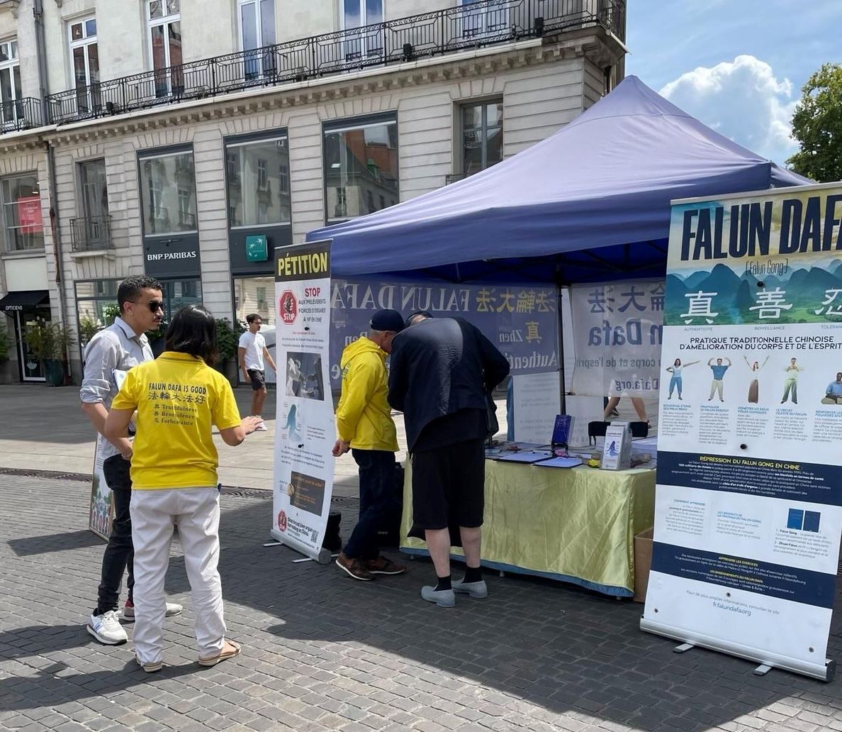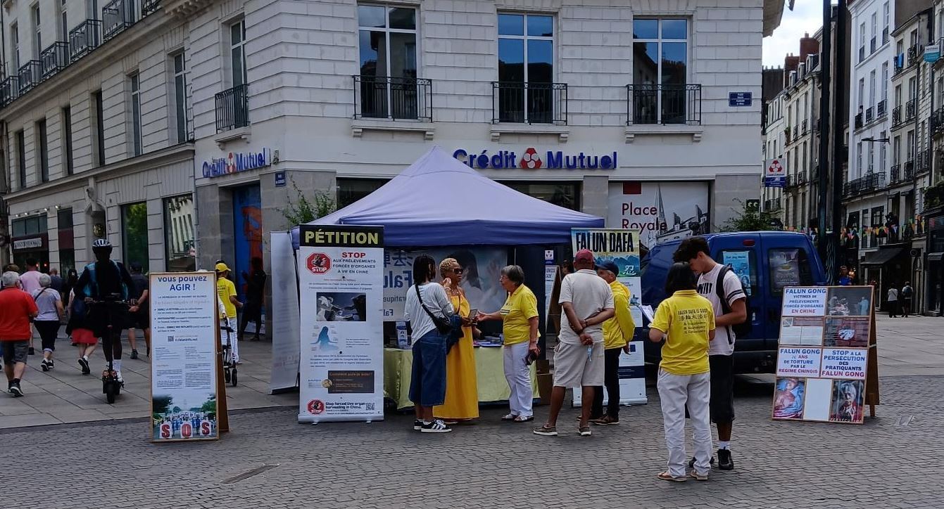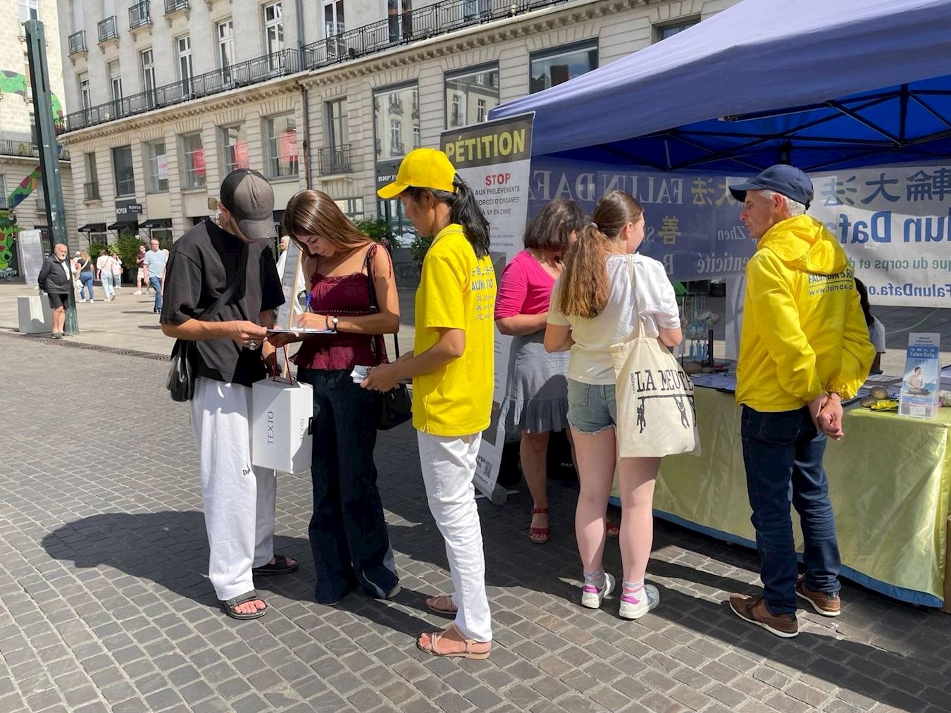 居住在南特的退休妇女玛丽-保尔(Marie-Paule)对法轮大法表示了浓厚的兴趣。得知这种修炼方法及其修炼者在中国已经遭受中共迫害二十六年后,她表示这是不可理解的。当她得知修炼者被当作器官库时,她感到愤怒。她还表示,她的肾脏功能不佳,对她来说要么是移植,要么是透析。然后她补充说,不应该去中国助长这种交易。在离开之前,她签署了请愿书,并拿了传单资料以便学炼法轮功。她感谢法轮功学员的行动。