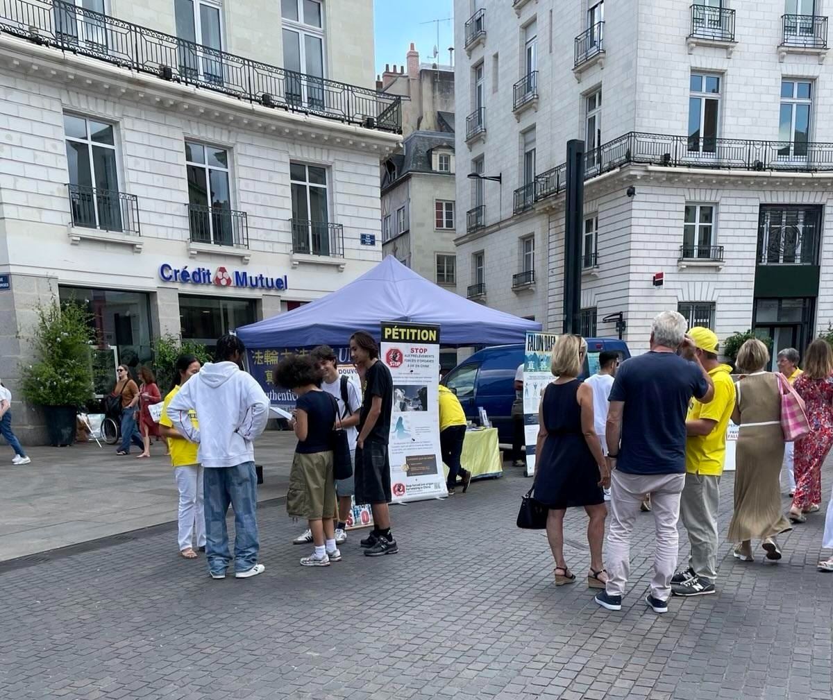 【明慧网二零二五年八月五日】二零二五年八月二日星期六,法国西部的法轮功学员在南特(Nantes)举办了法轮功信息日活动。他们在皇家广场搭起信息台,悬挂横幅,摆放展板,分发资讯传单,征集请愿签名。